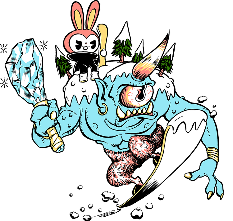 Snoclops may only have one eye, but he sees everything on the mountain (his eye is pretty big). Often accompanied by one of SnoBunny’s SnoBunnies riding on his shoulder (we think he has a soft spot for SnoBunny as she also sees out of only one eye), he loves gettin’ the chatter goin’ on the backside of the mountain (close to his cave).