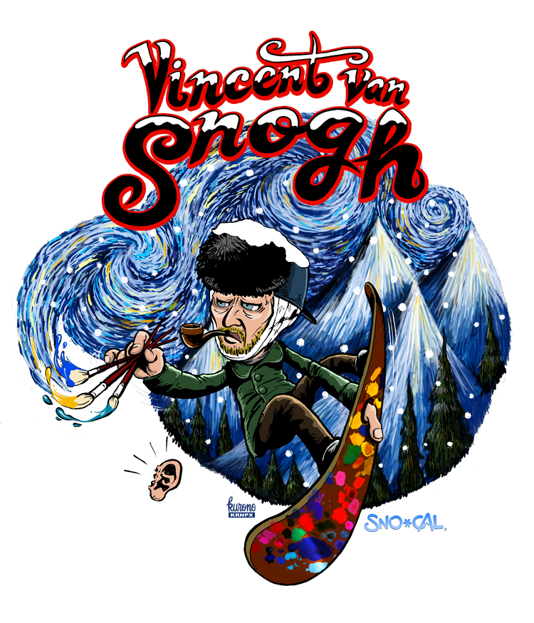 Vincent van Snogh uses his snowboard as his easel. What happened to his ear though? We're loving this van Gogh Starry Night influenced design by our friend, Japanese artist Kurono. We call it Snowy Night.