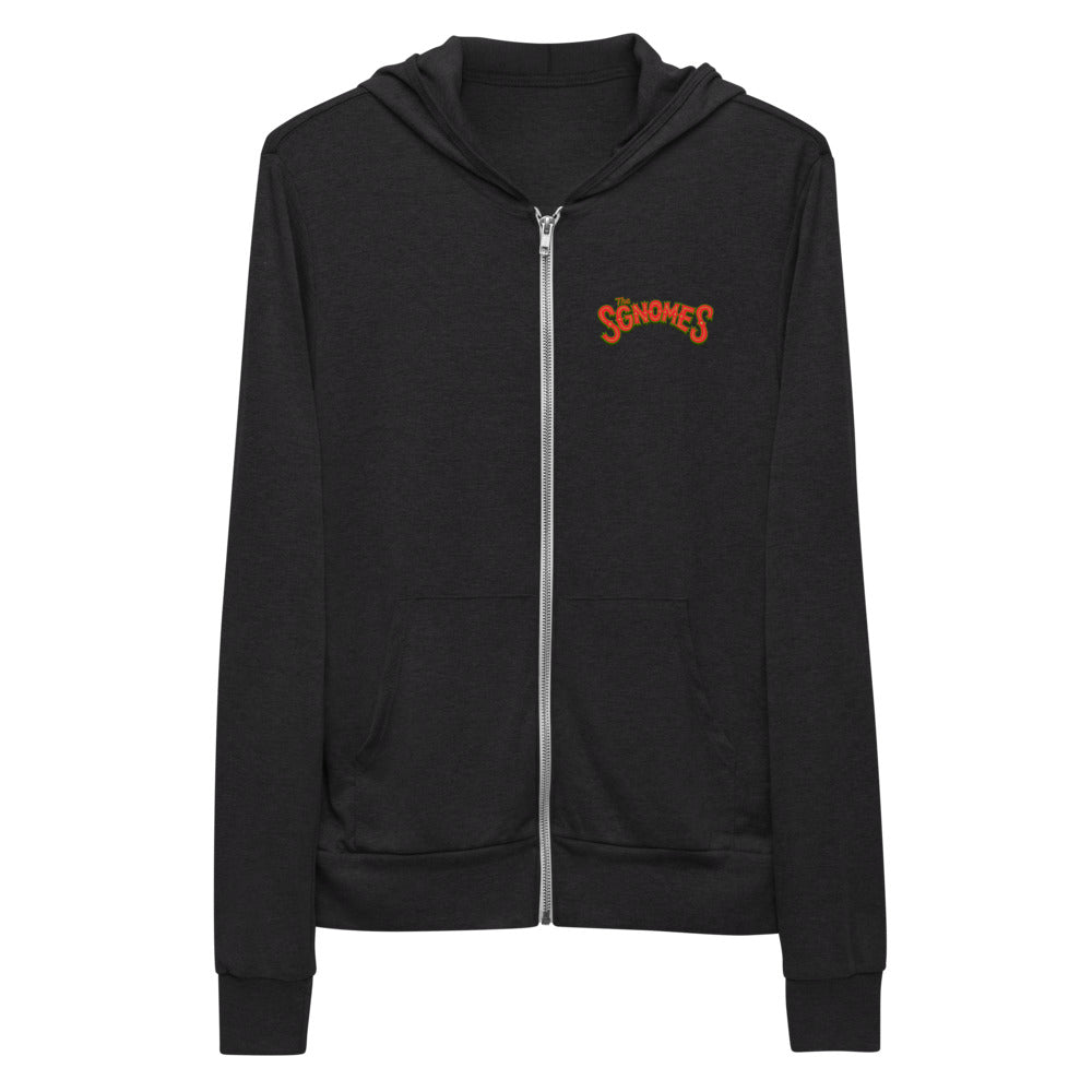 Lightweight zip hoodie with kangaroo pocket with the wild Sgnomes snowboarding.