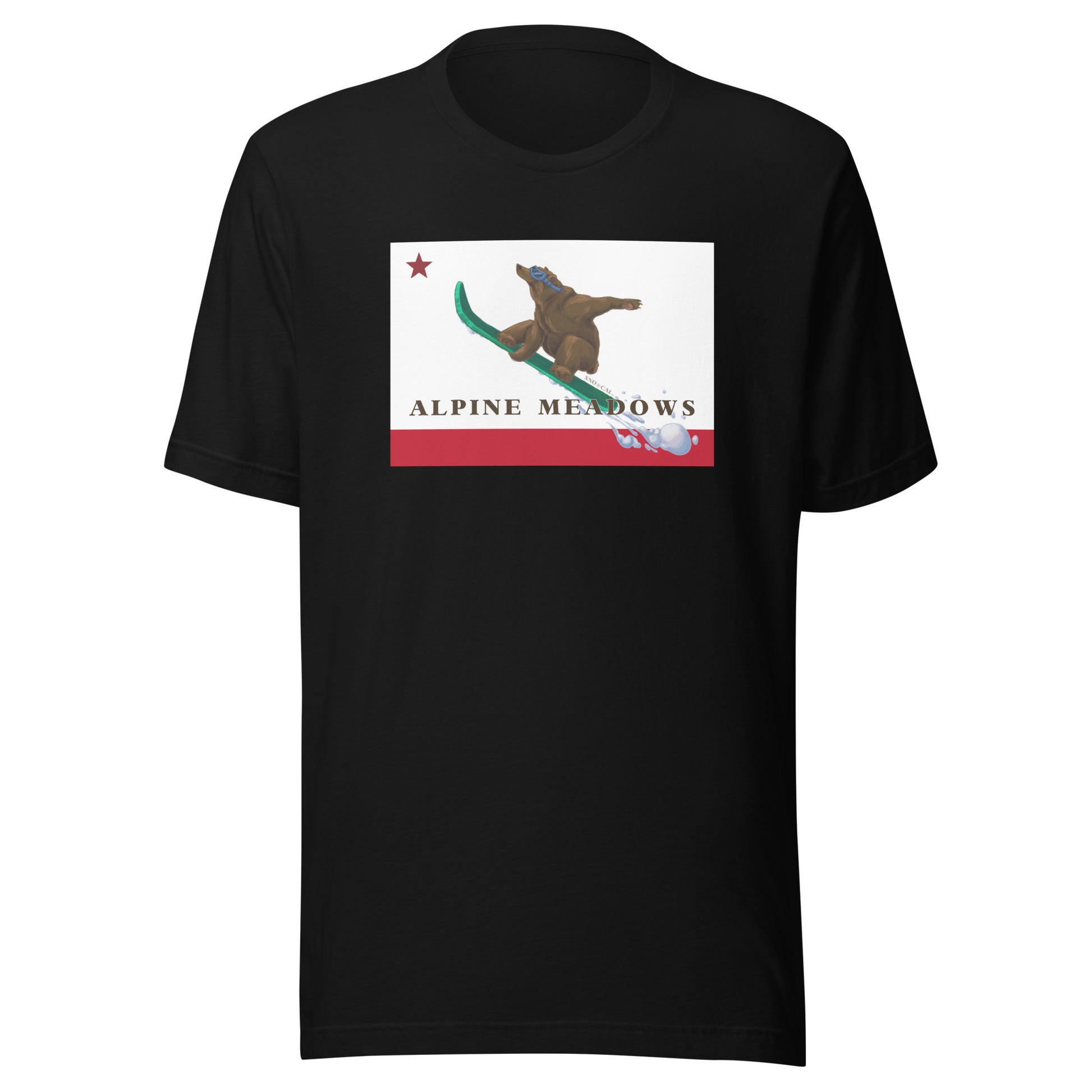 Alpine Meadows shirt with CA flag style and snowboarding Goldie the Grizzly.