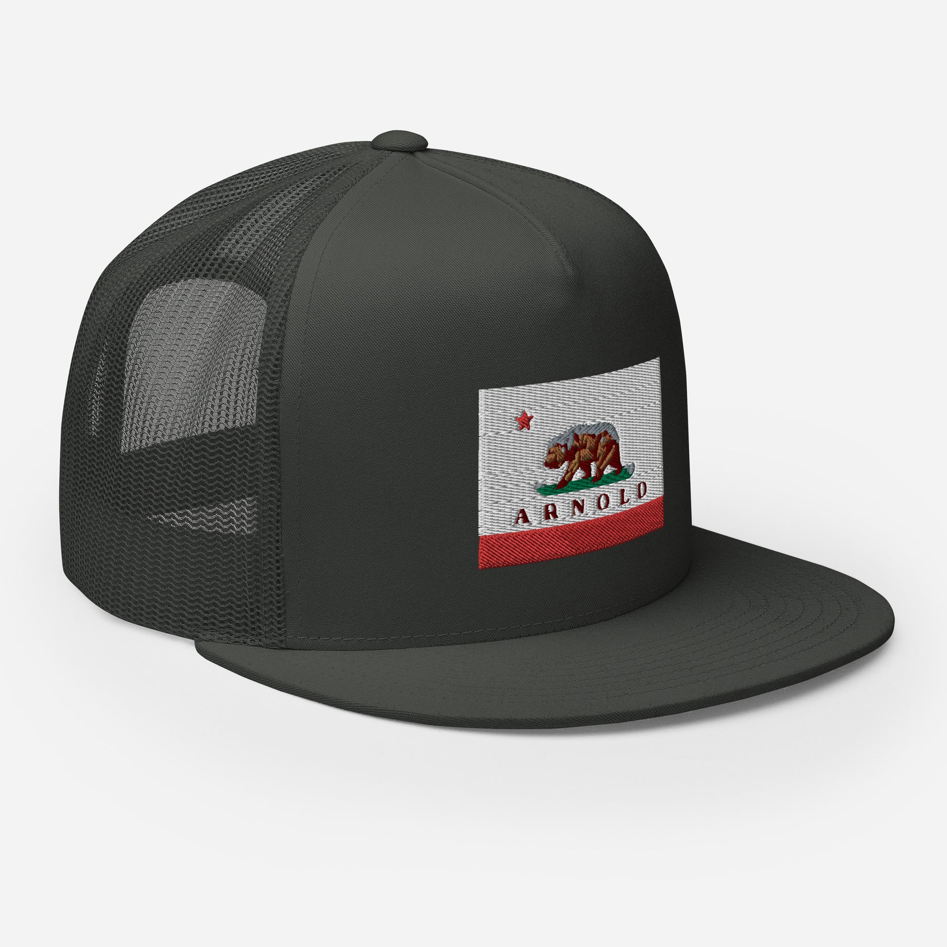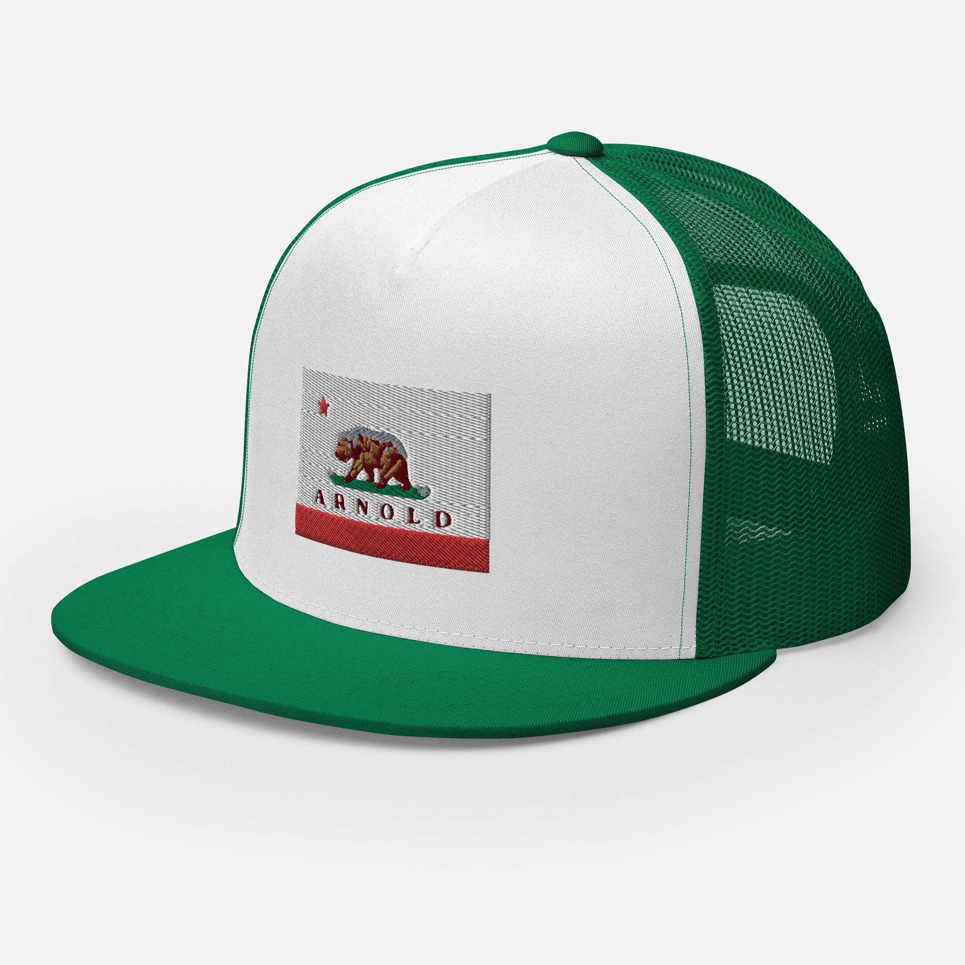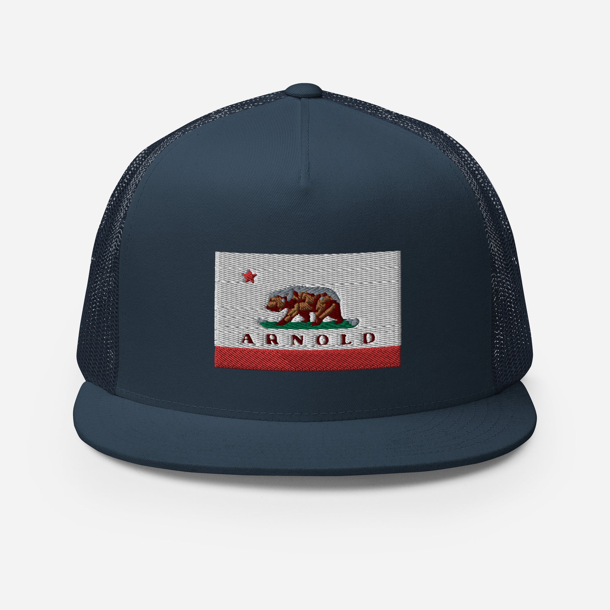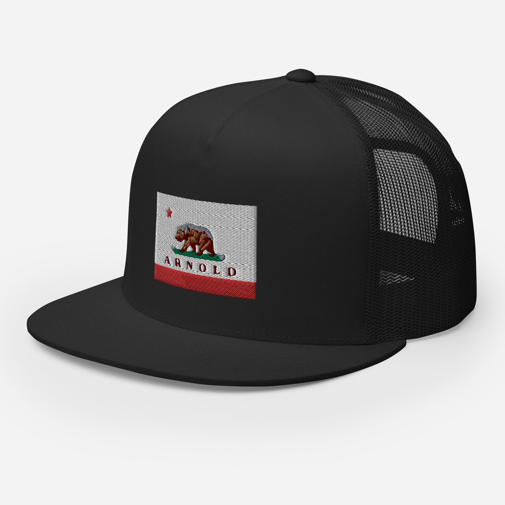 Classic trucker style Arnold cap with a cool fabric blend, Arnold written on CA flag.
