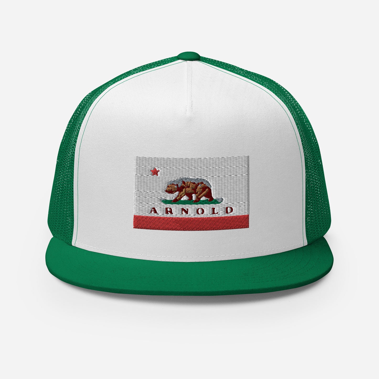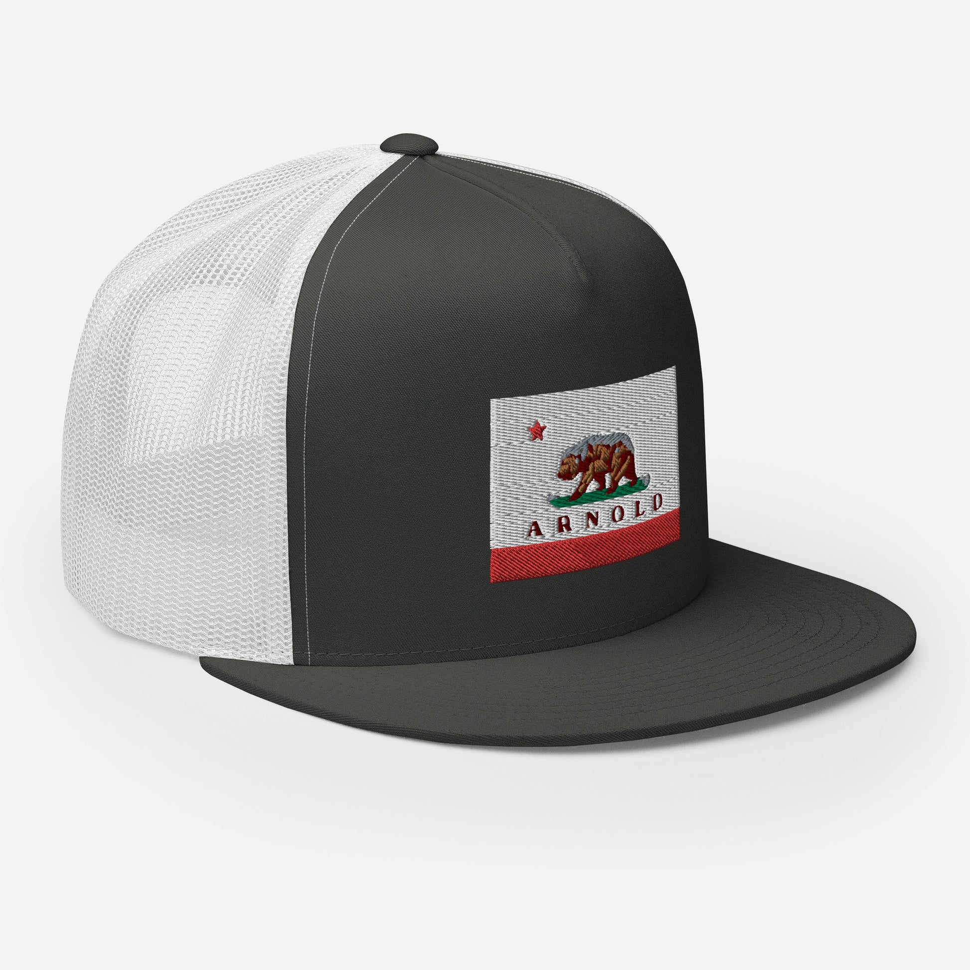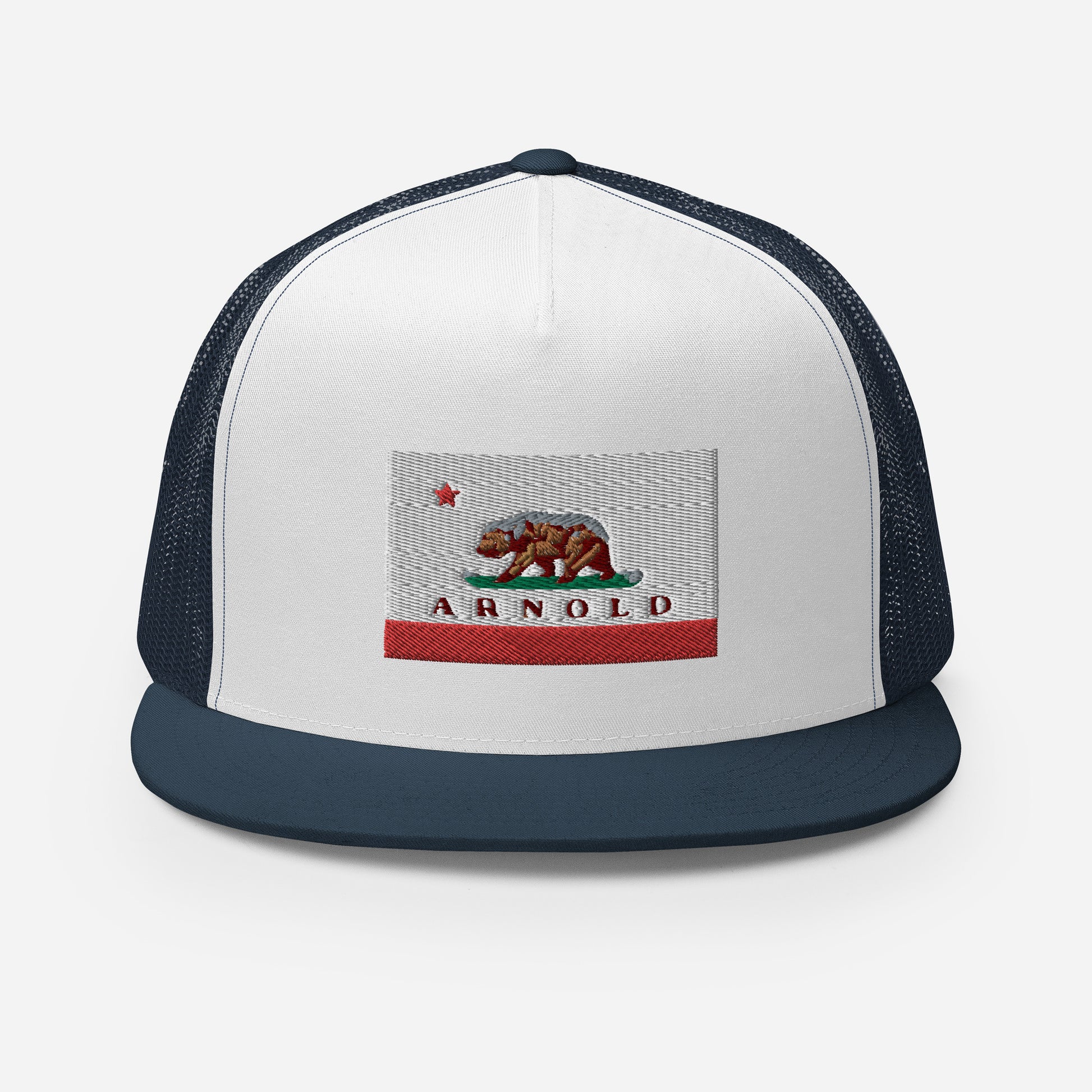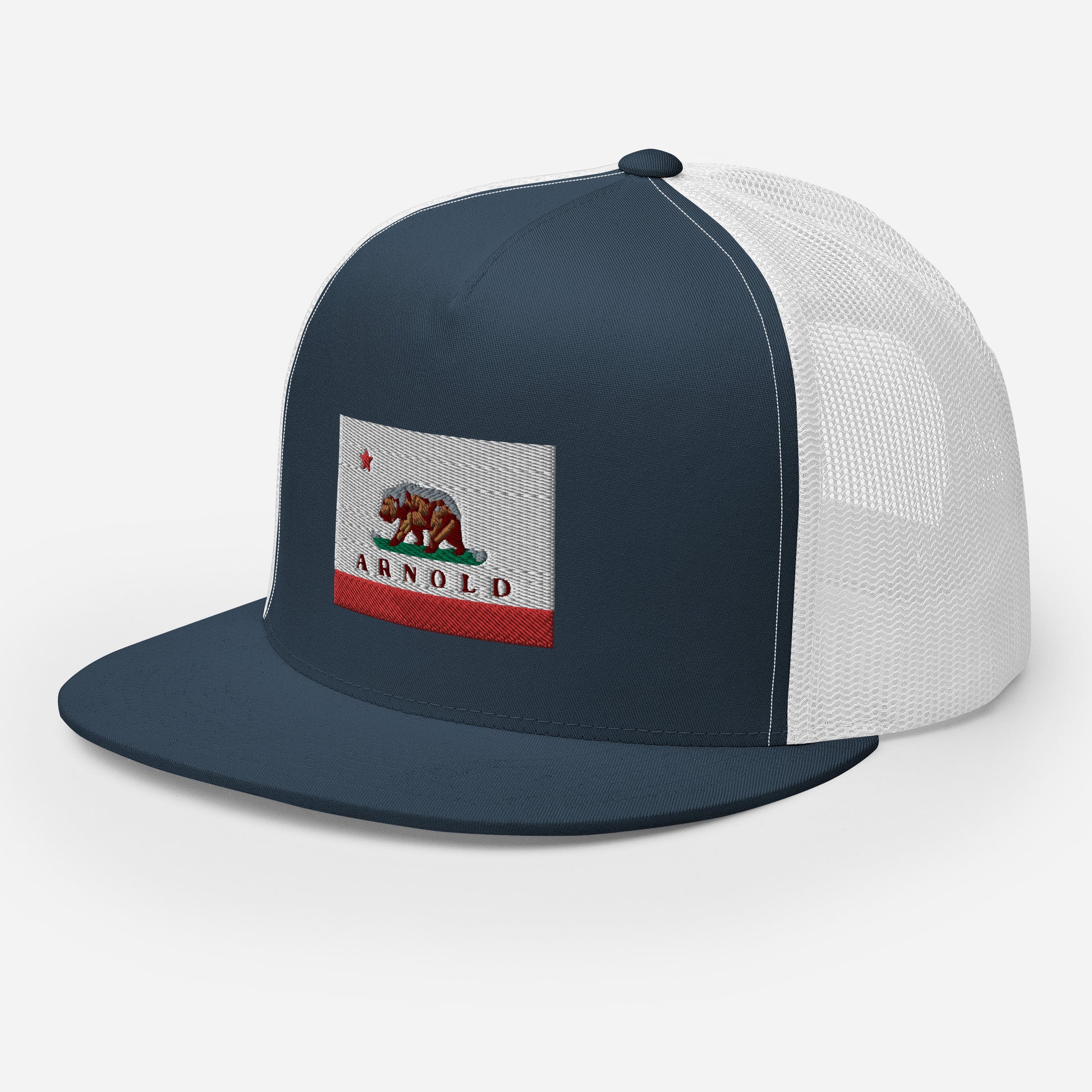 Classic trucker style Arnold cap with a cool fabric blend, Arnold written on CA flag.