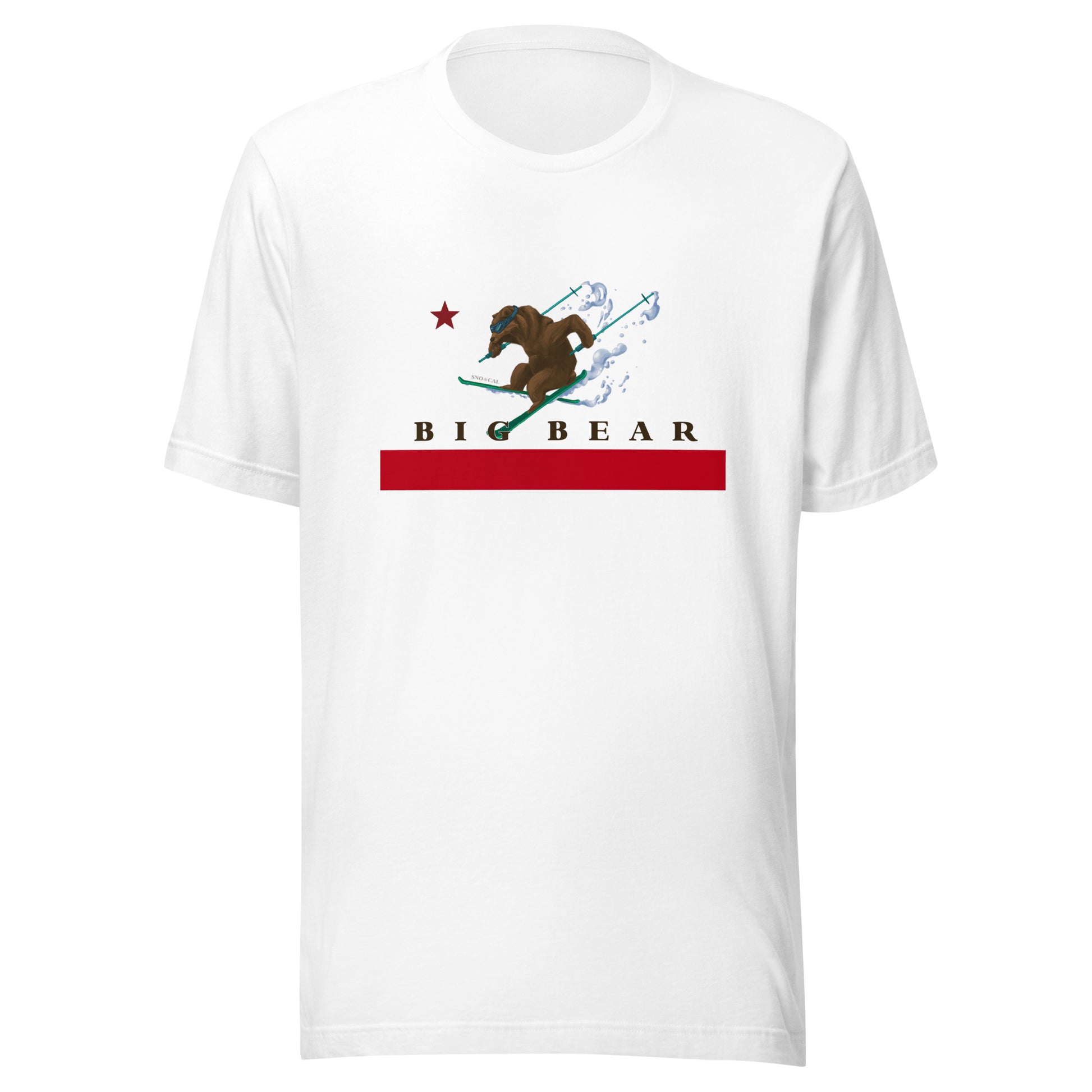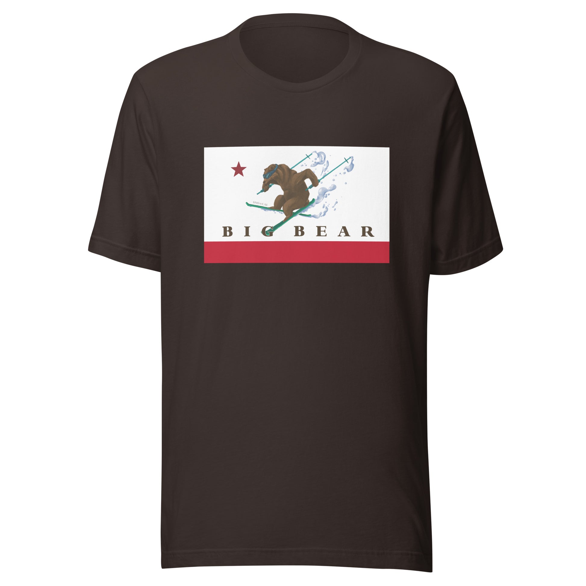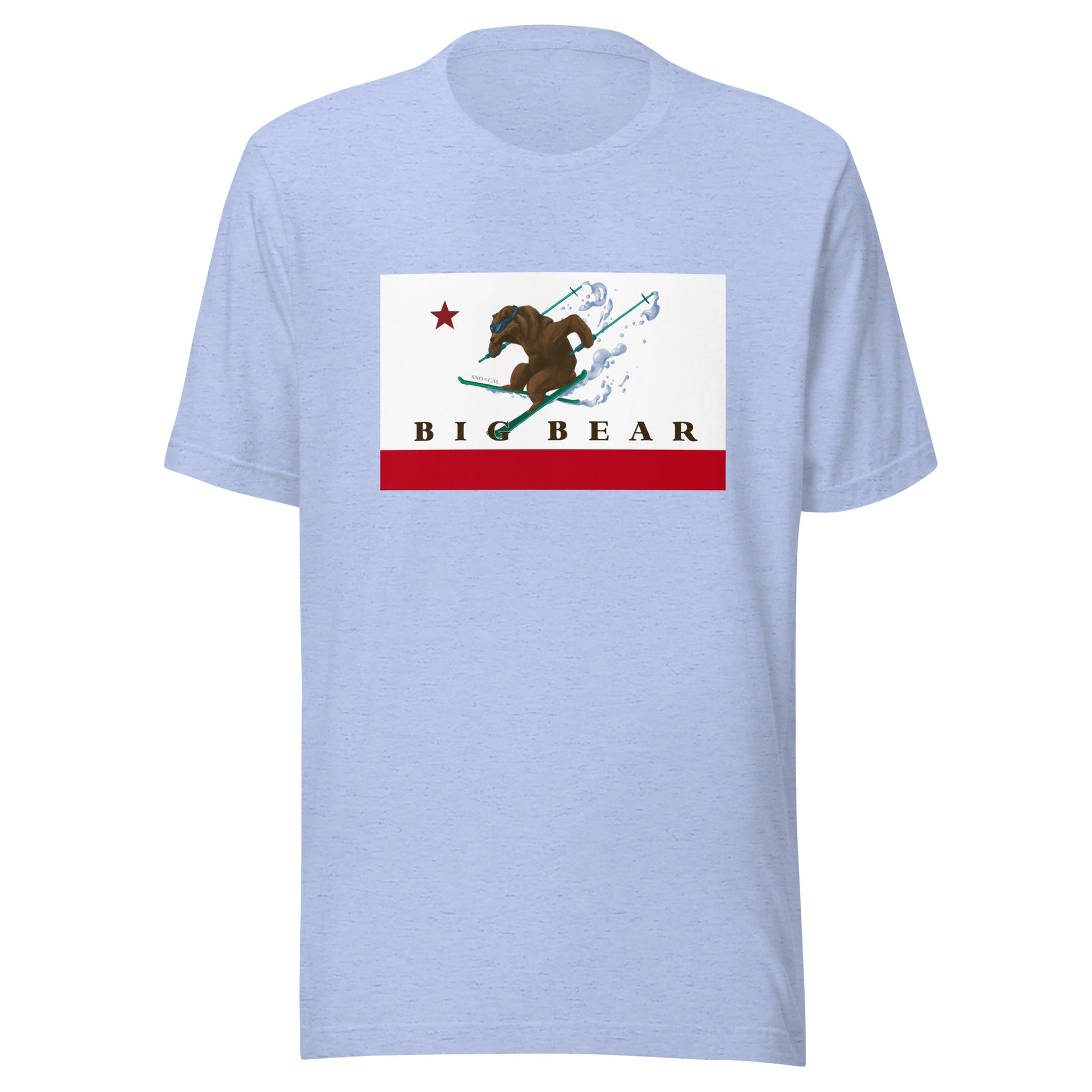 Super comfy tee with Big Bear CA Flag and grizzly bear skiing.