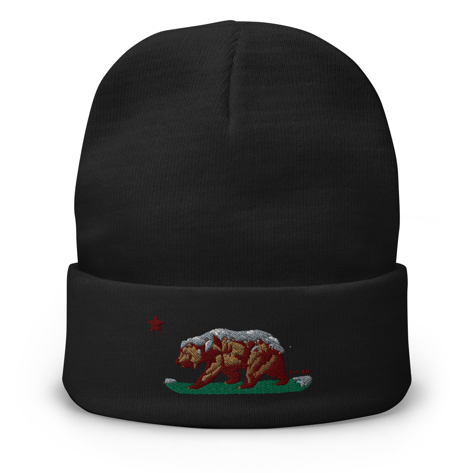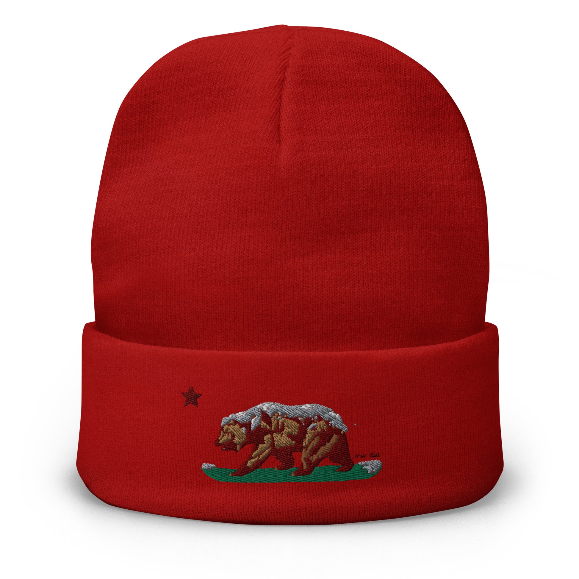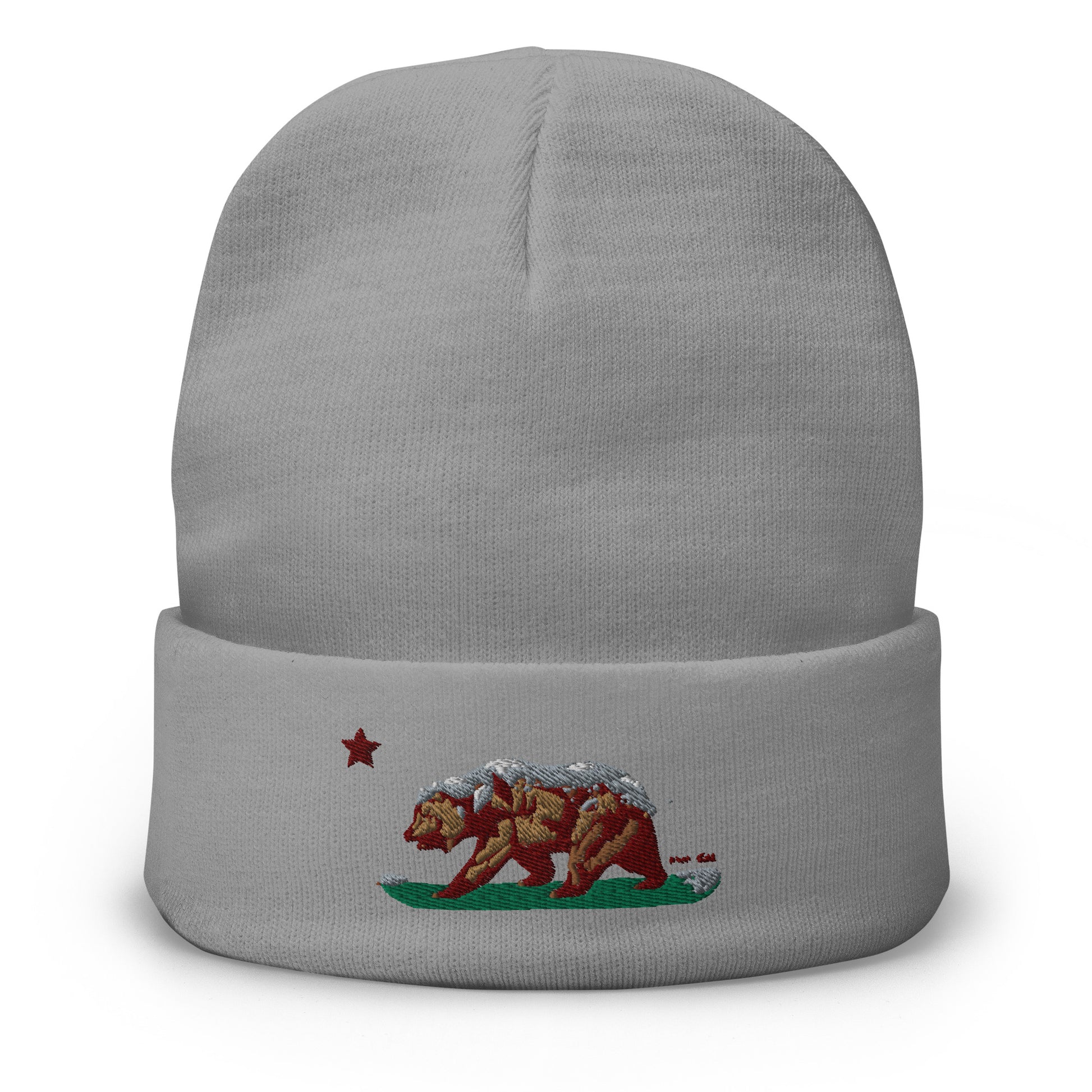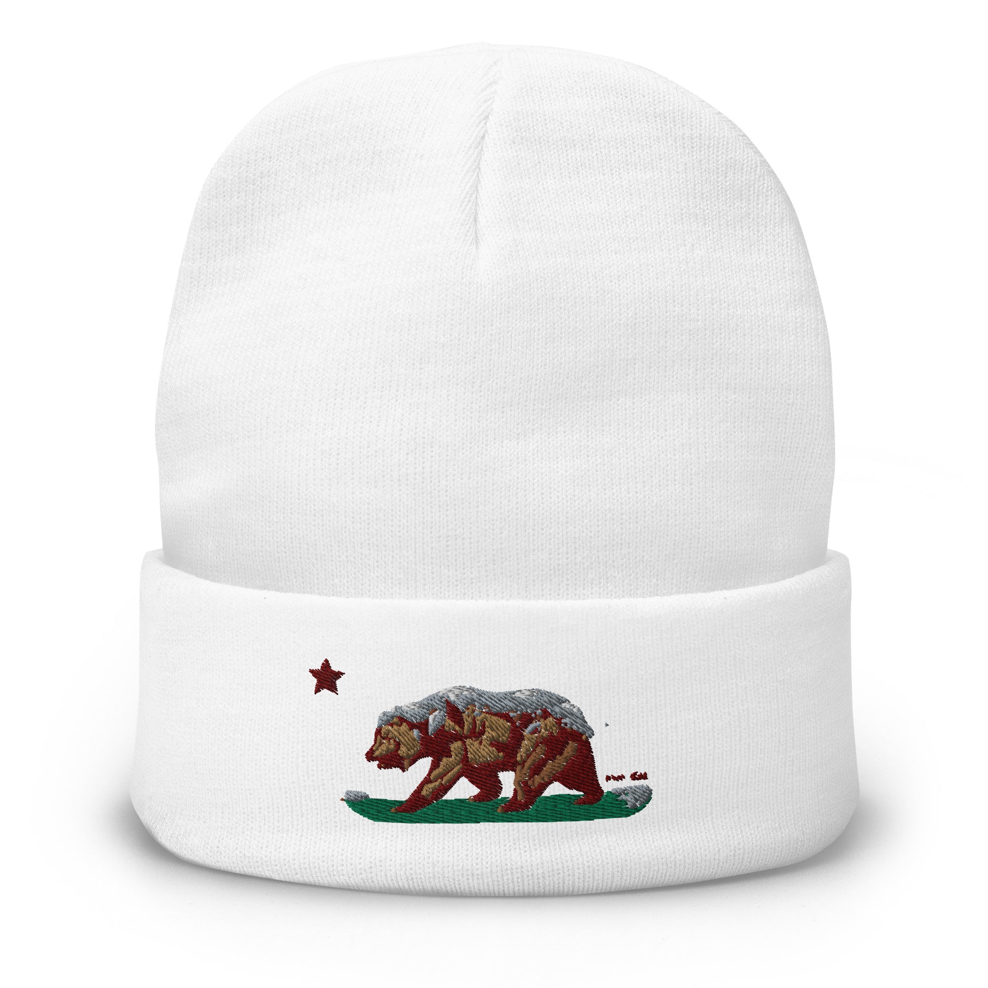 Goldie the California grizzly bear is on his board on this super soft & warm beanie.