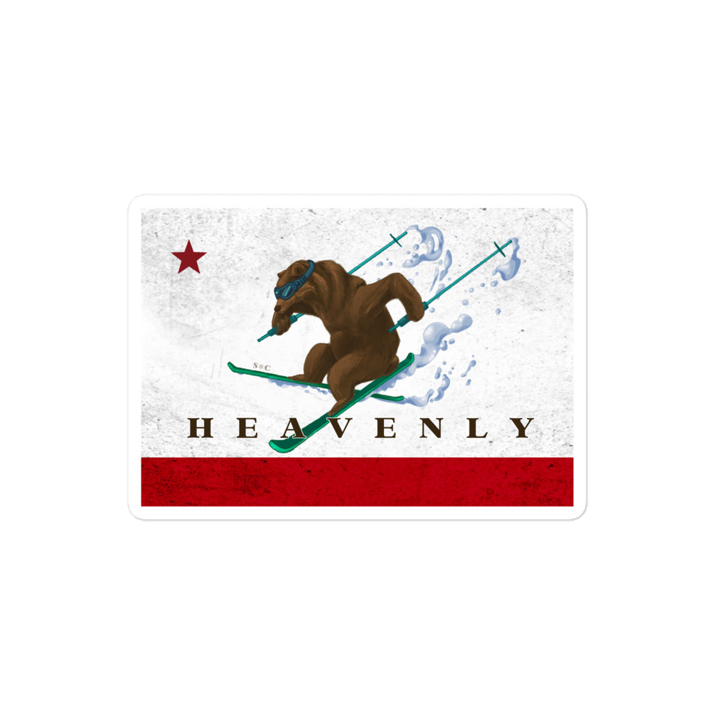 CA grizzly bear skiing with Heavenly lettering on the CA flag.