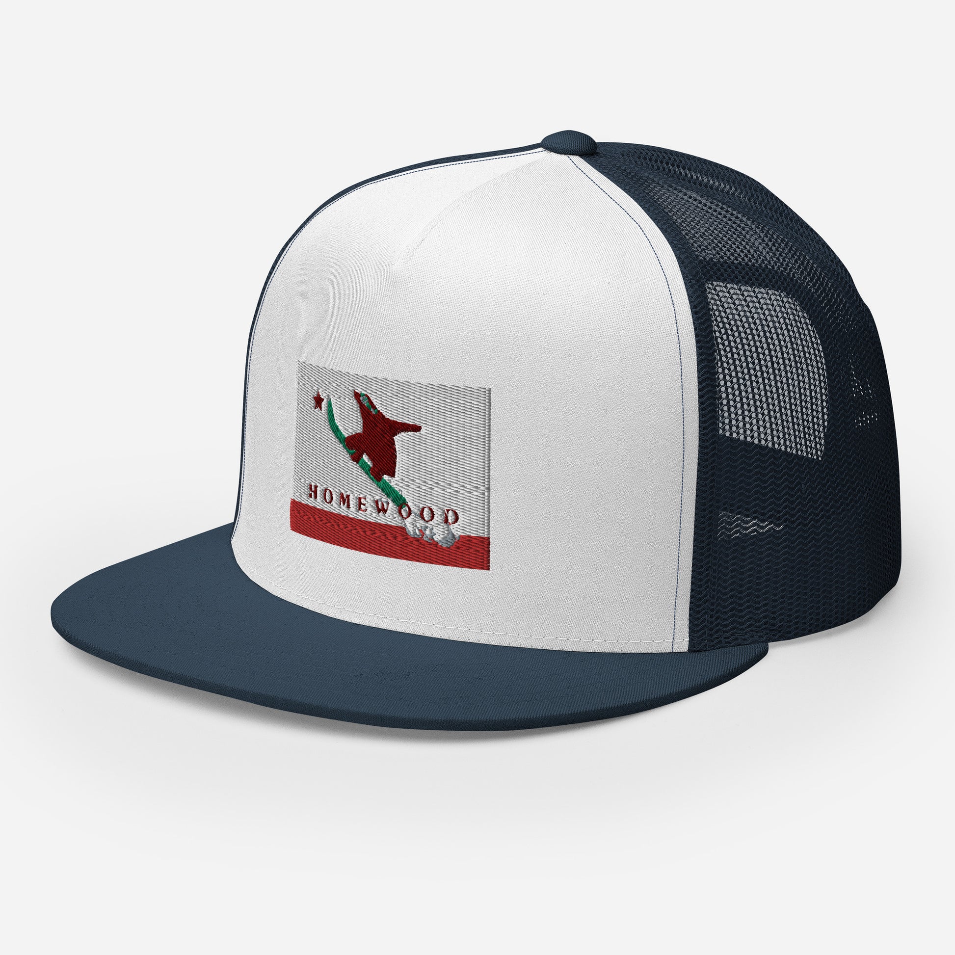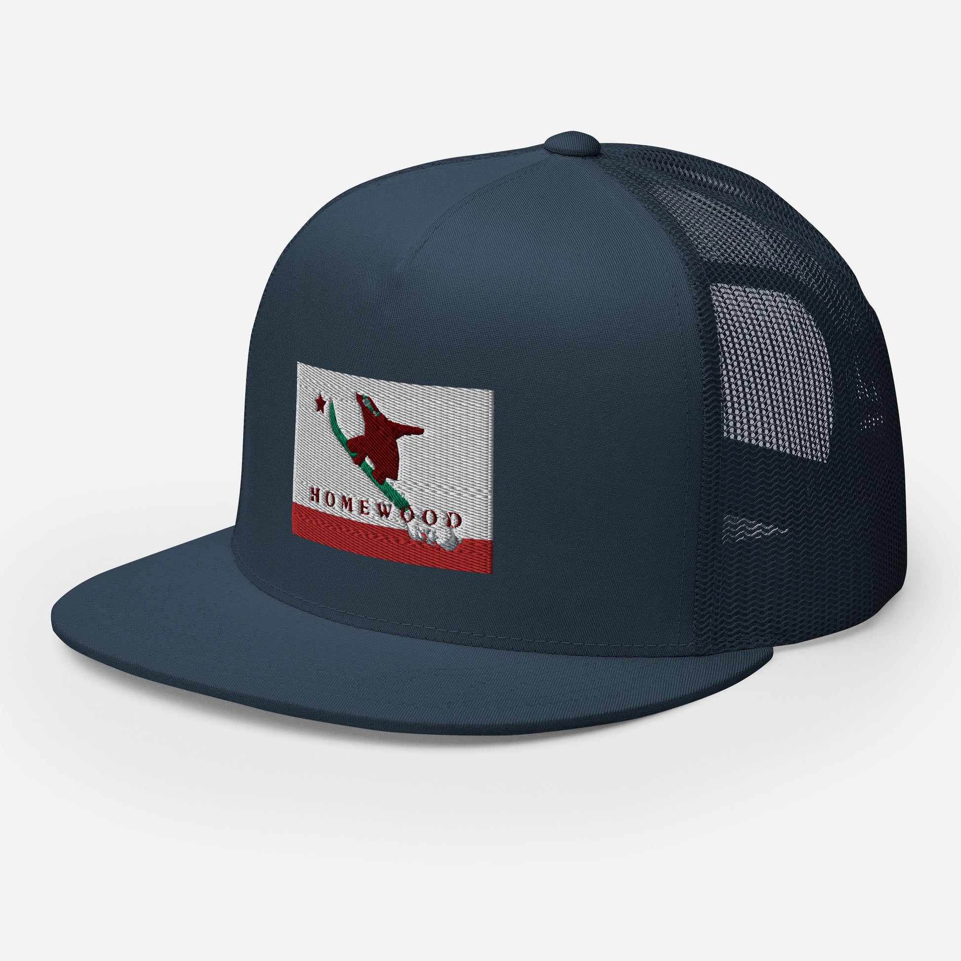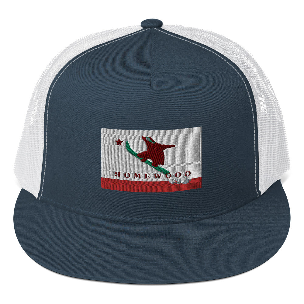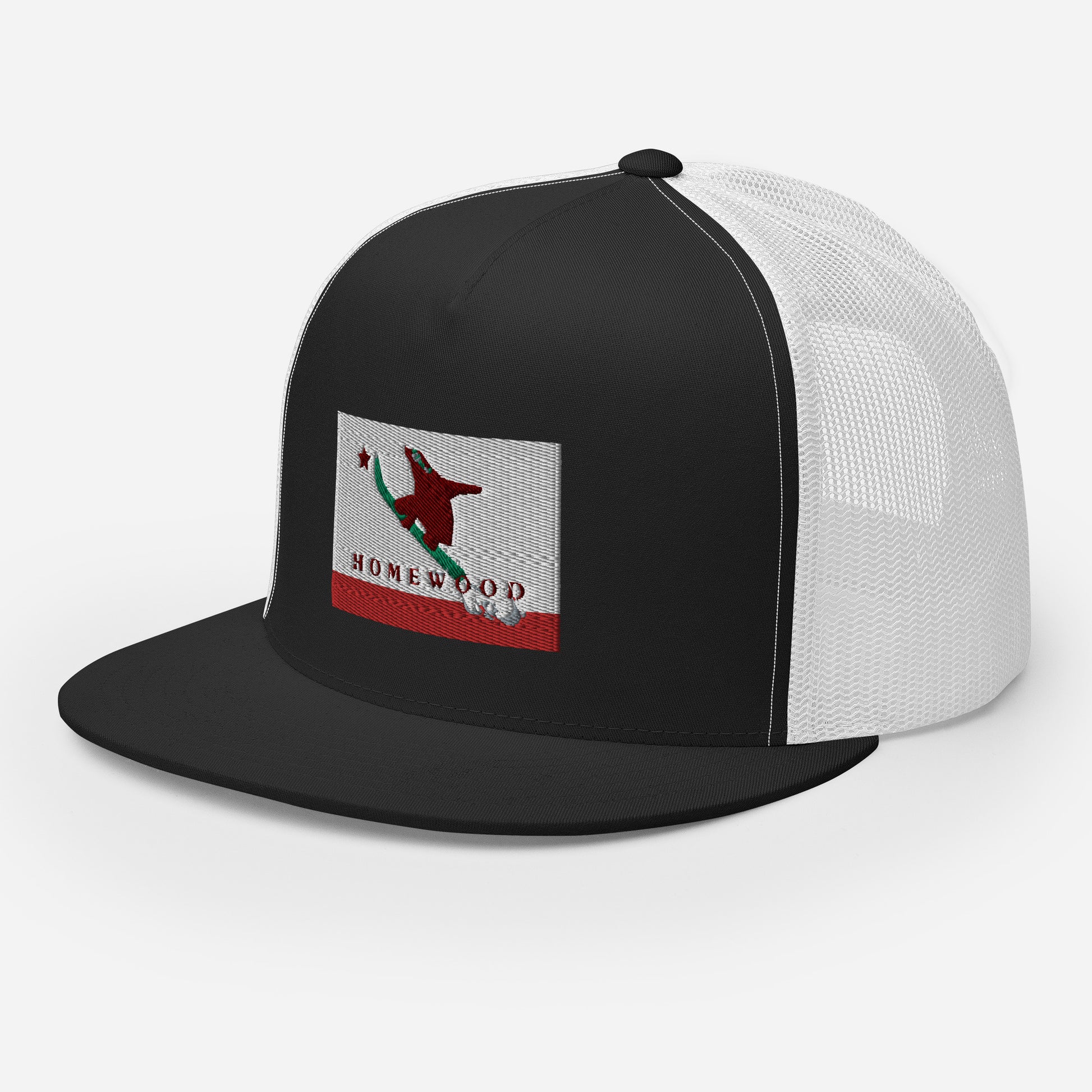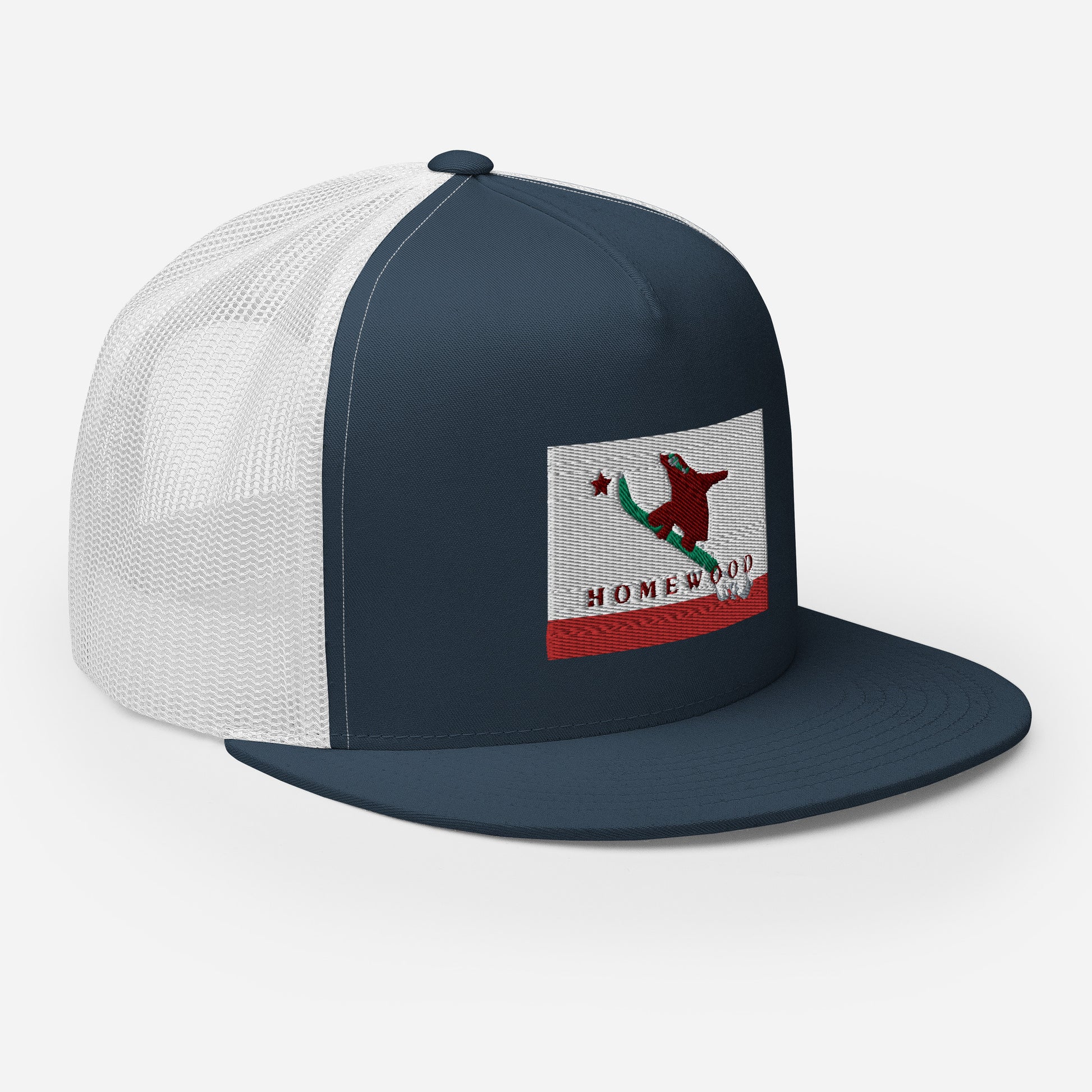 Homewood CA flag snowboard classic trucker cap style with a cool fabric blend.