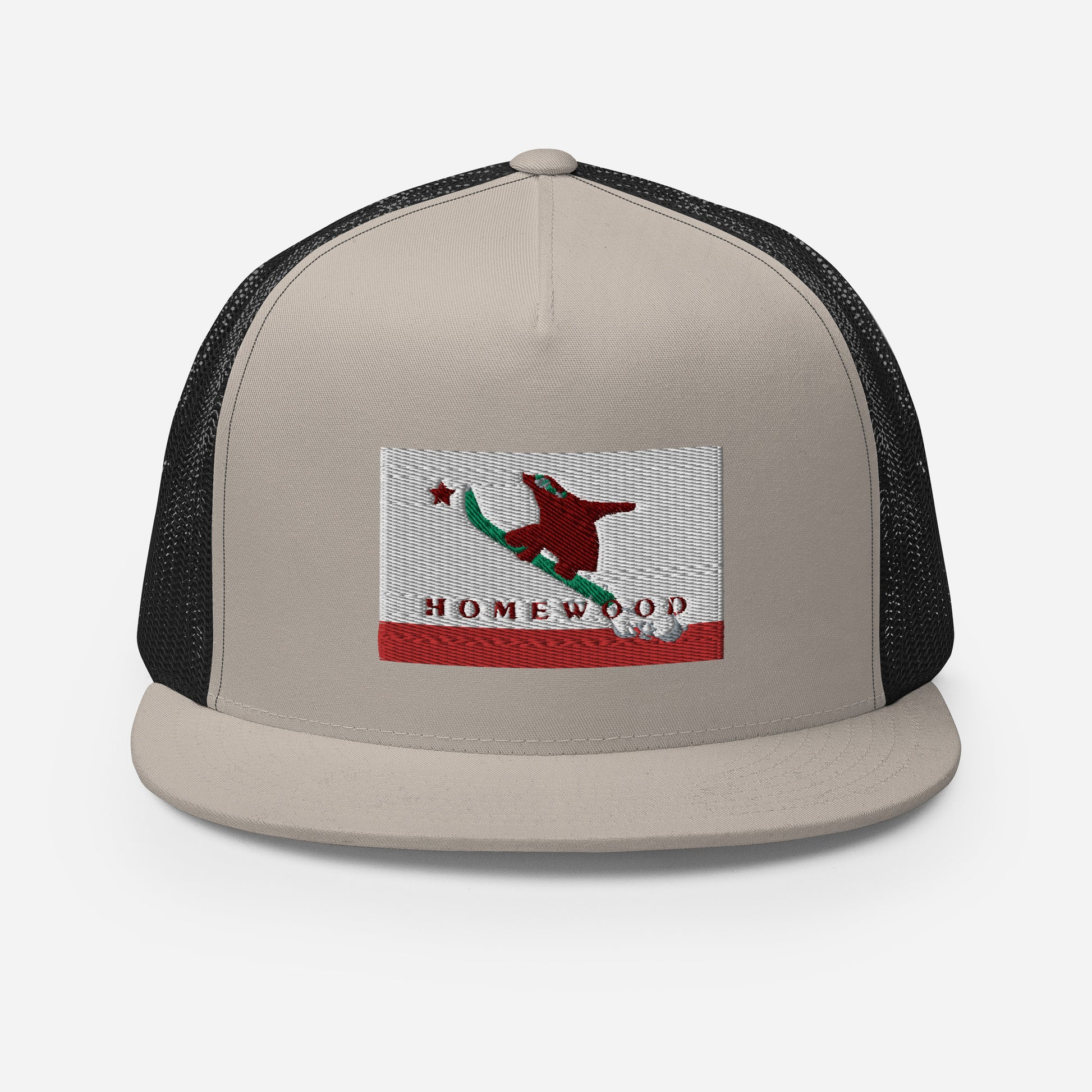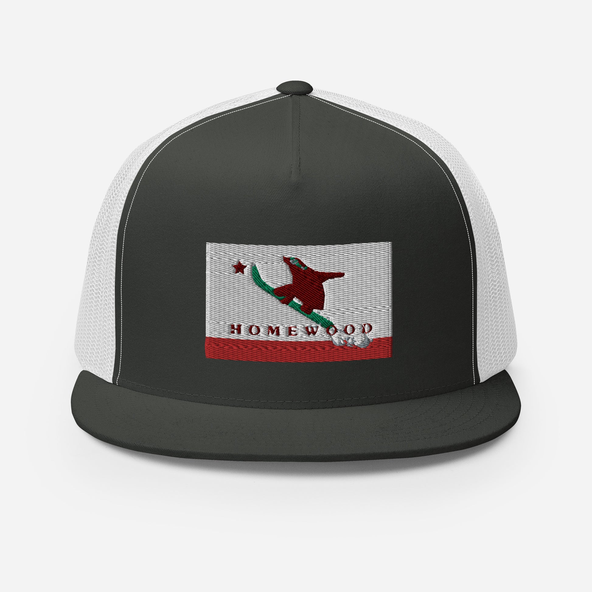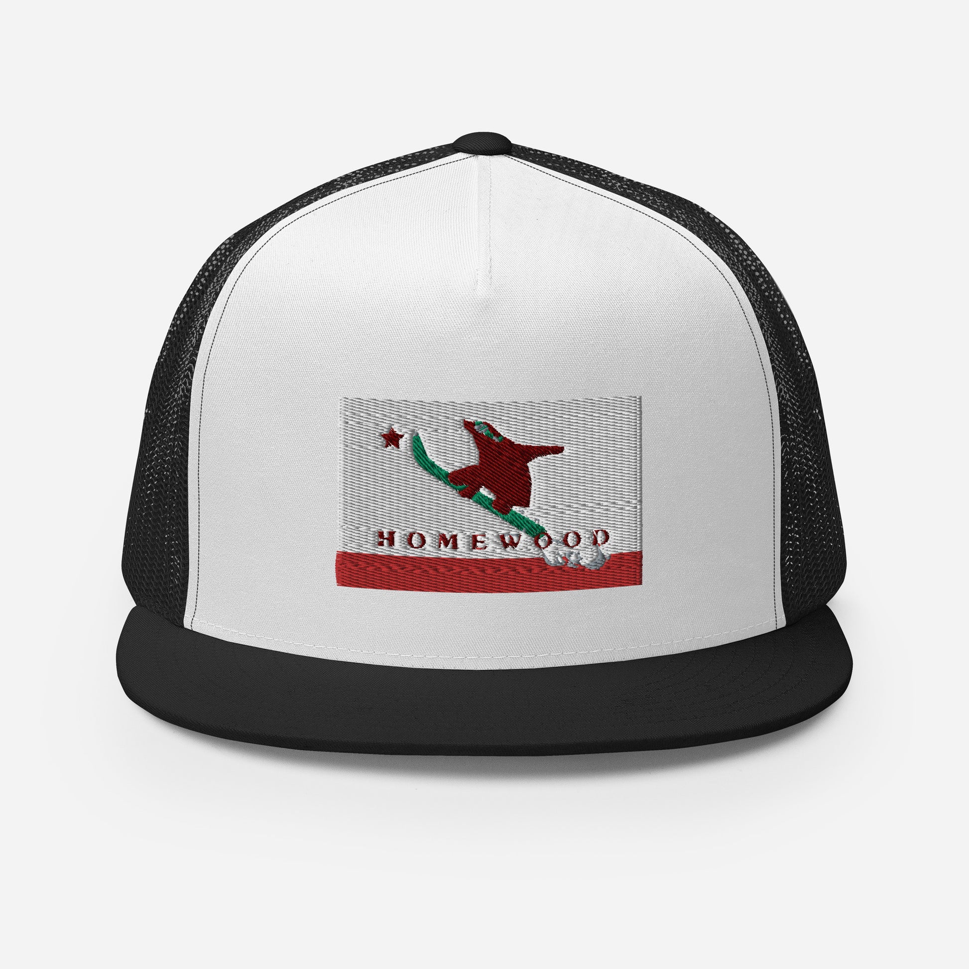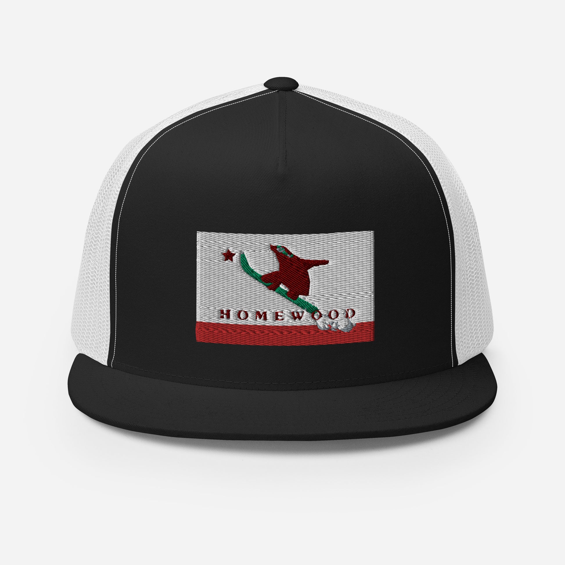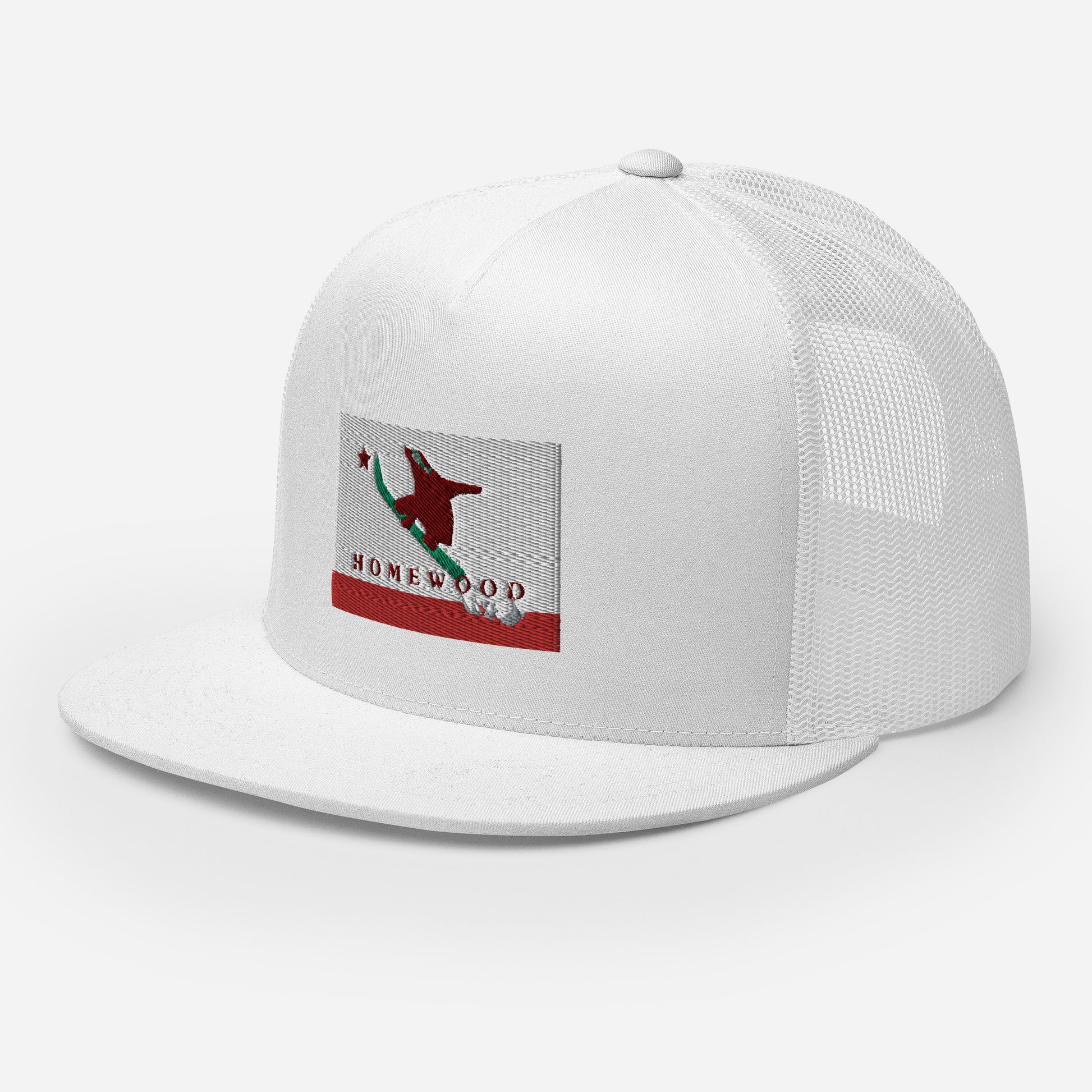 Homewood CA flag snowboard classic trucker cap style with a cool fabric blend.