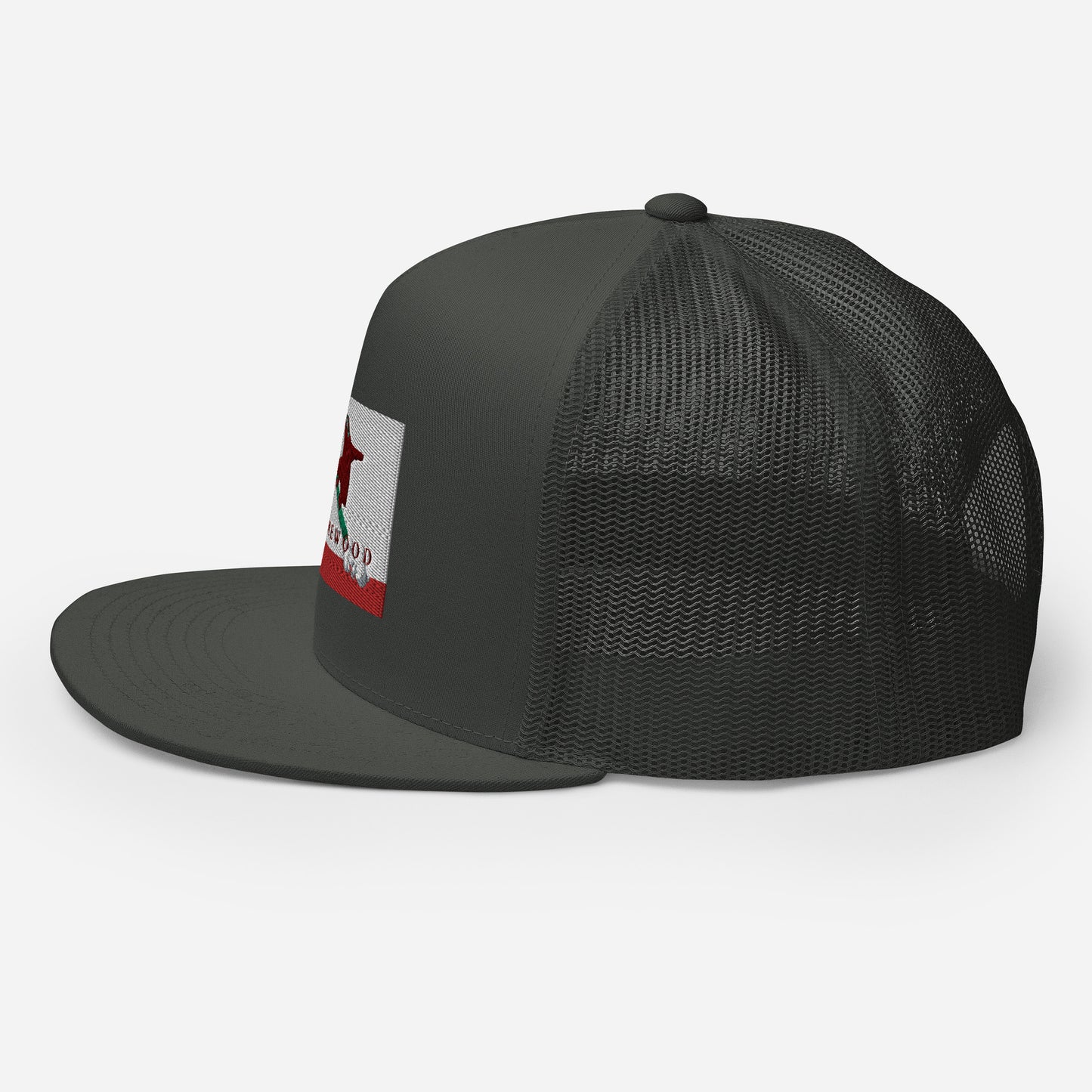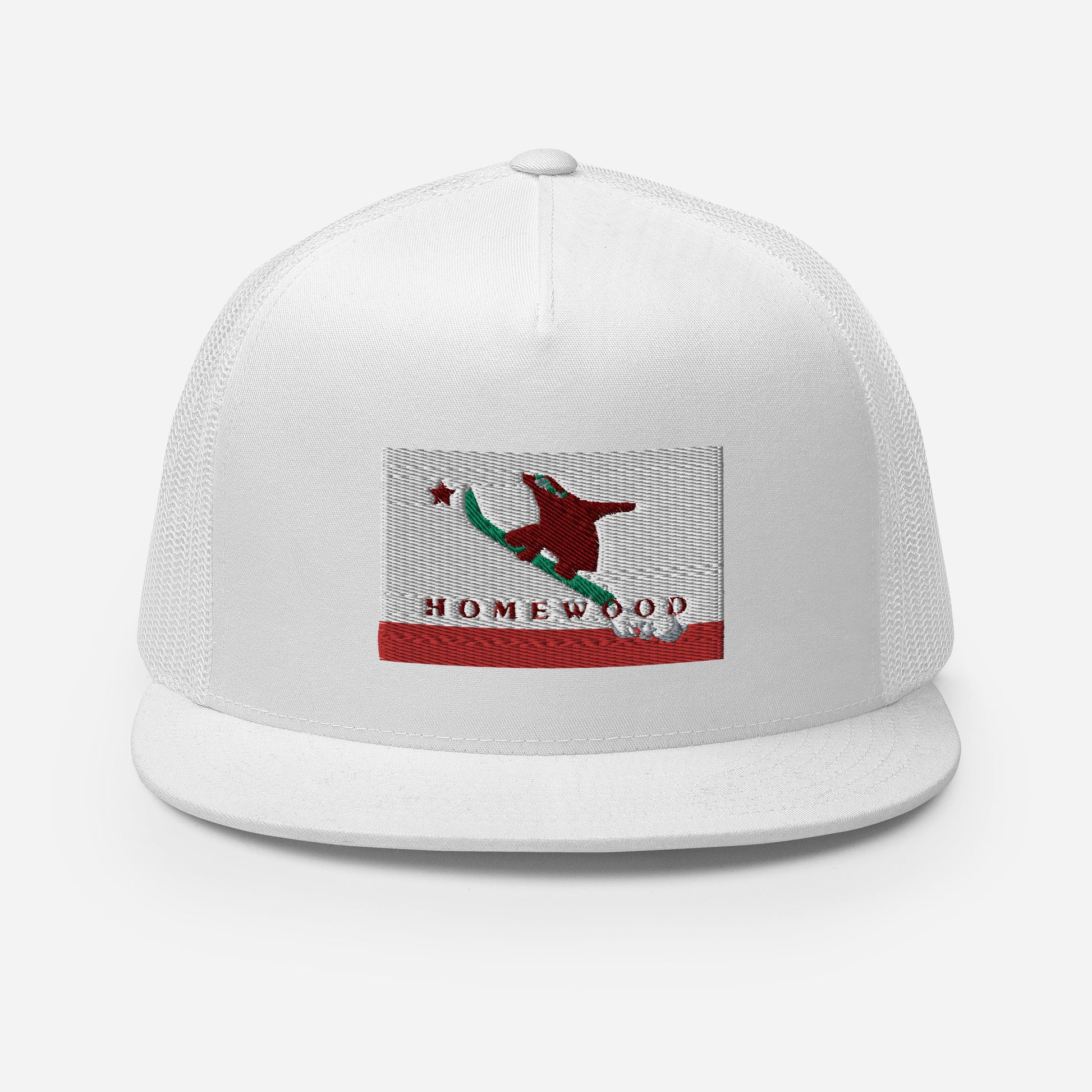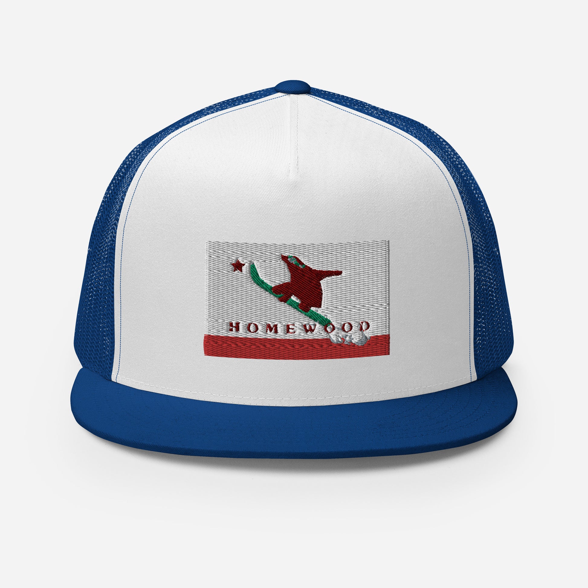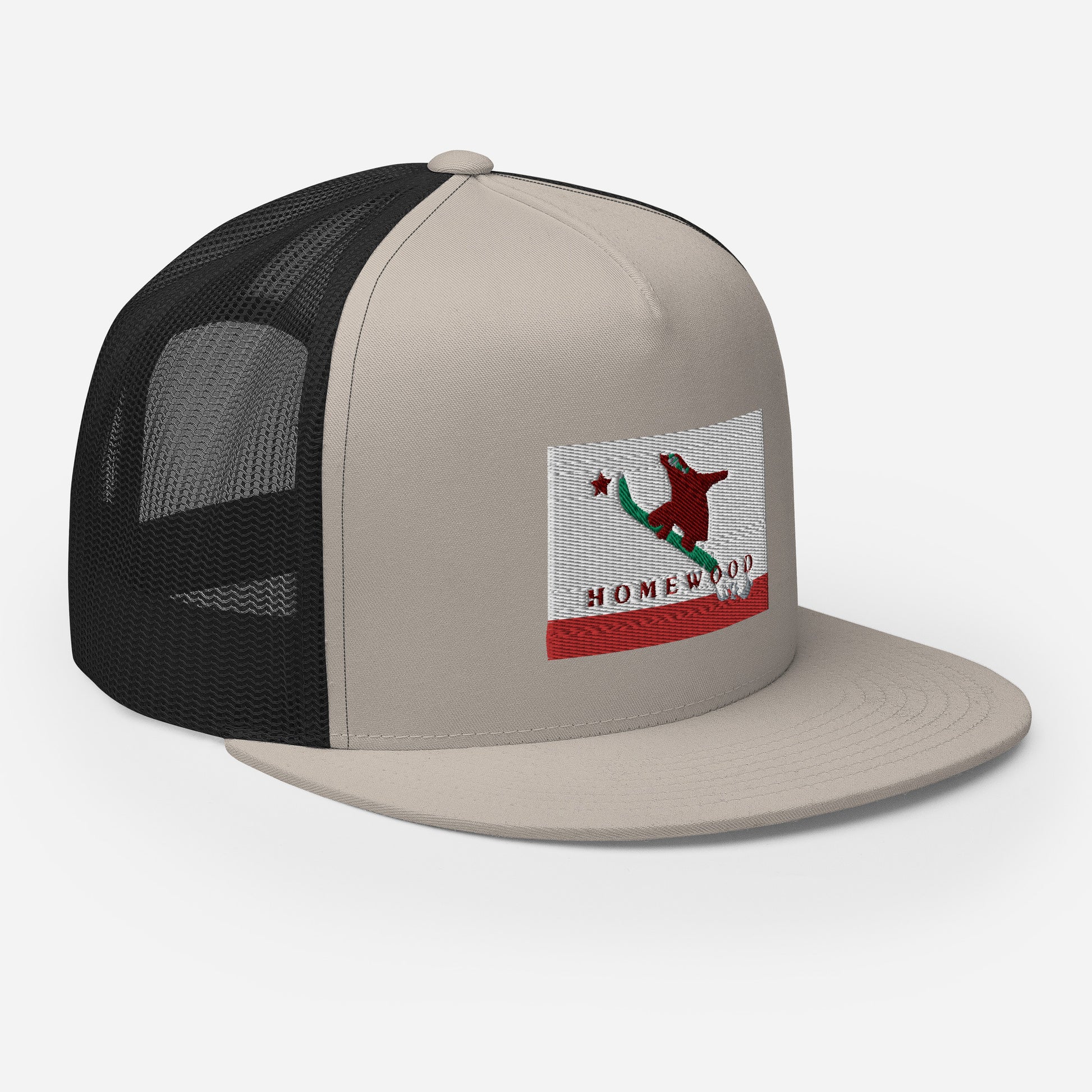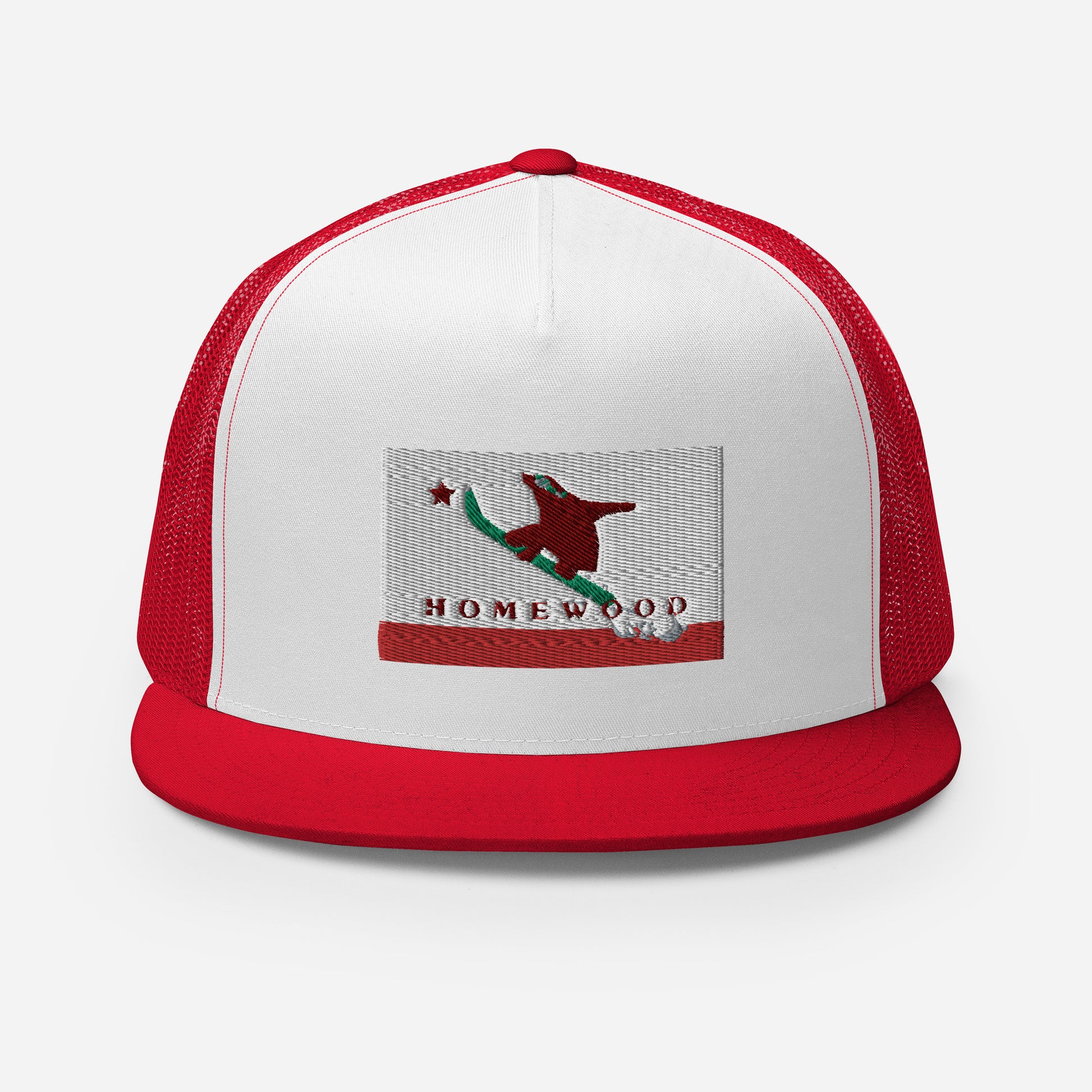 Homewood CA flag snowboard classic trucker cap style with a cool fabric blend.