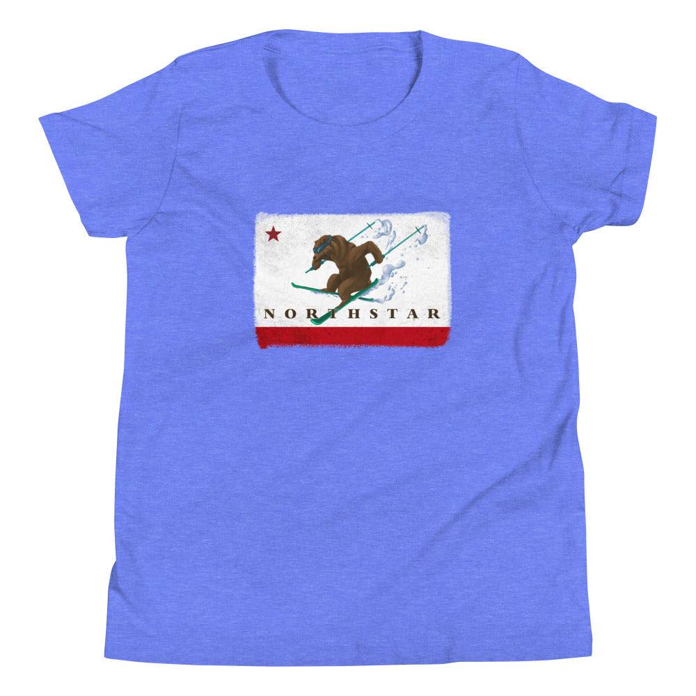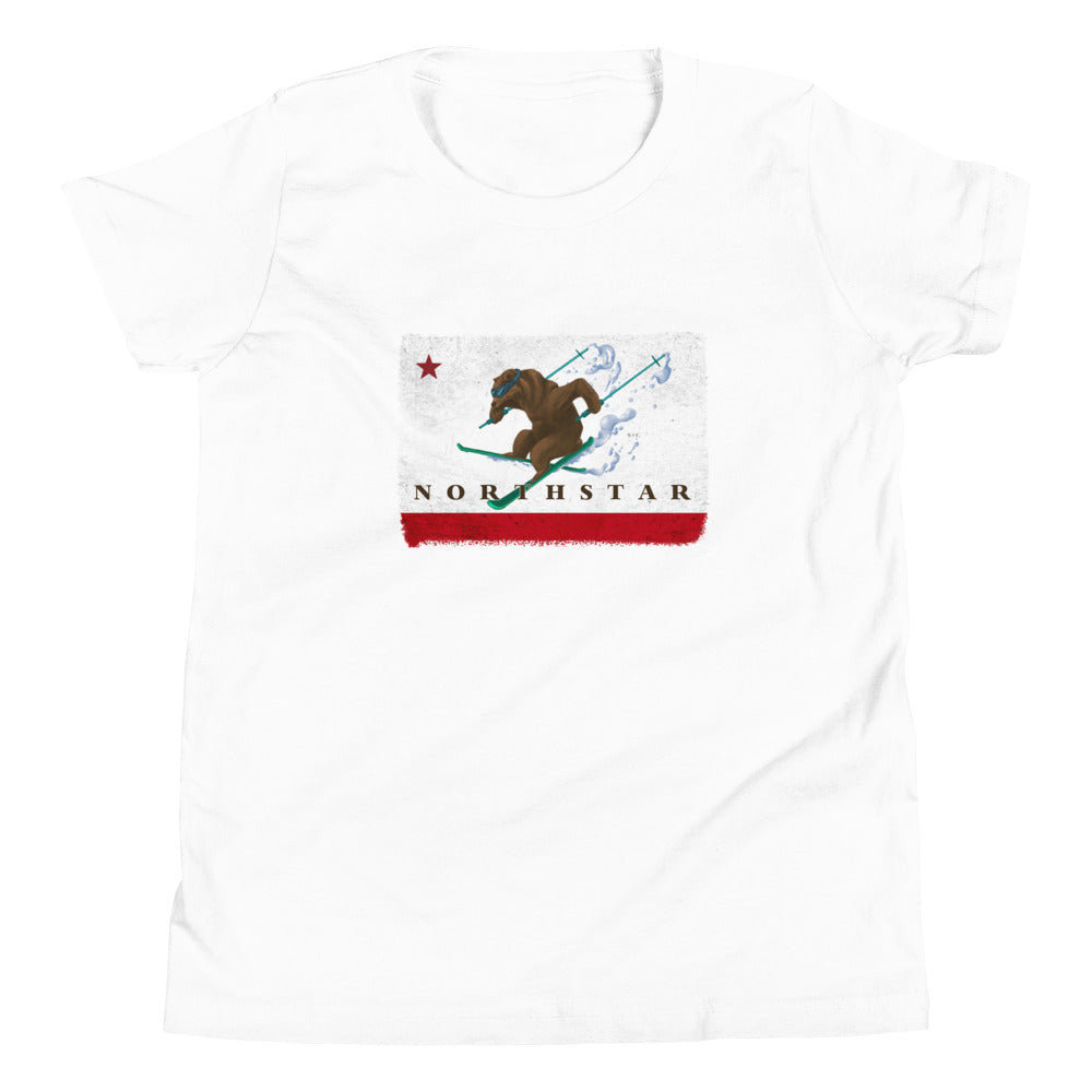 CA grizzly bear getting after it on his skis at North Star on this CA flag tee.