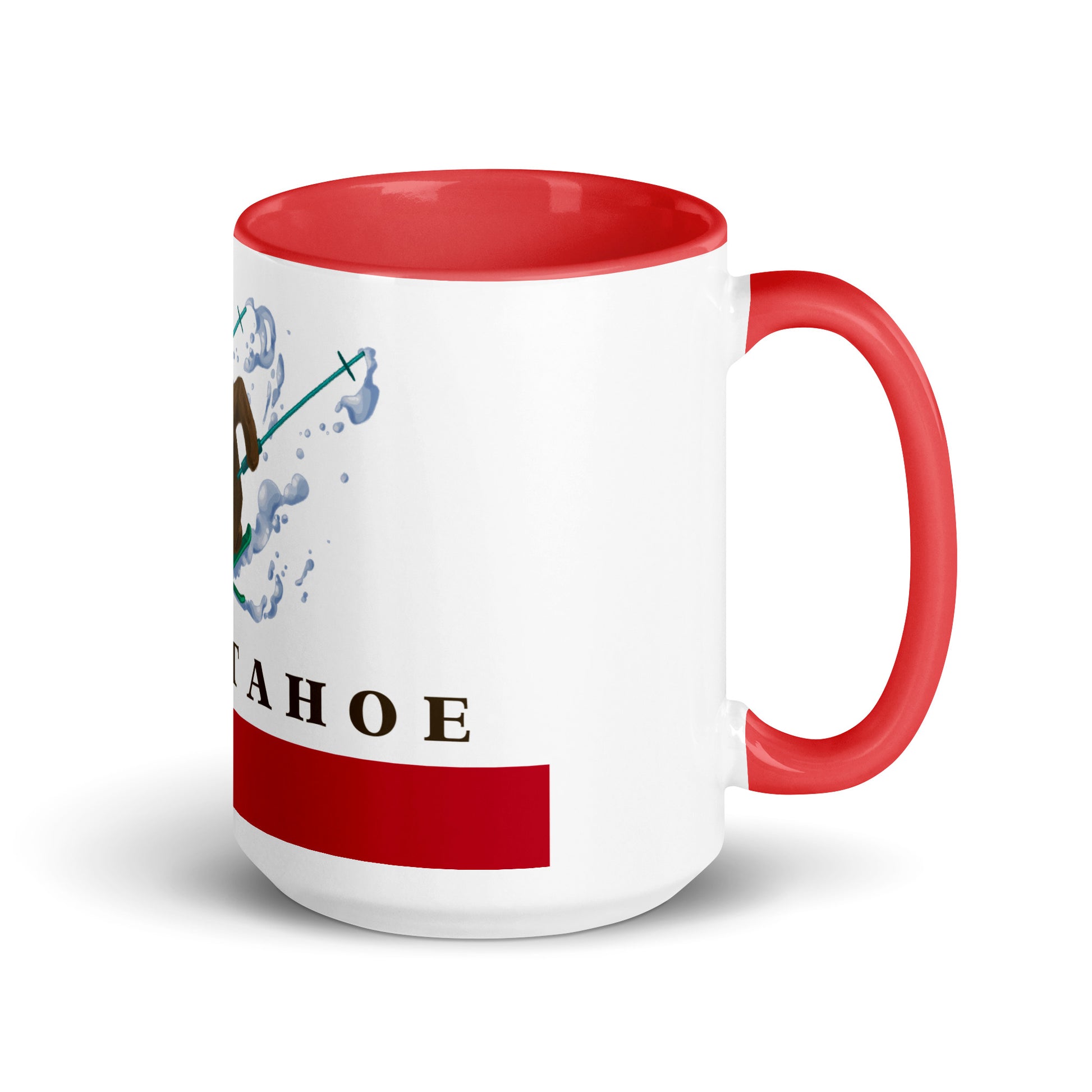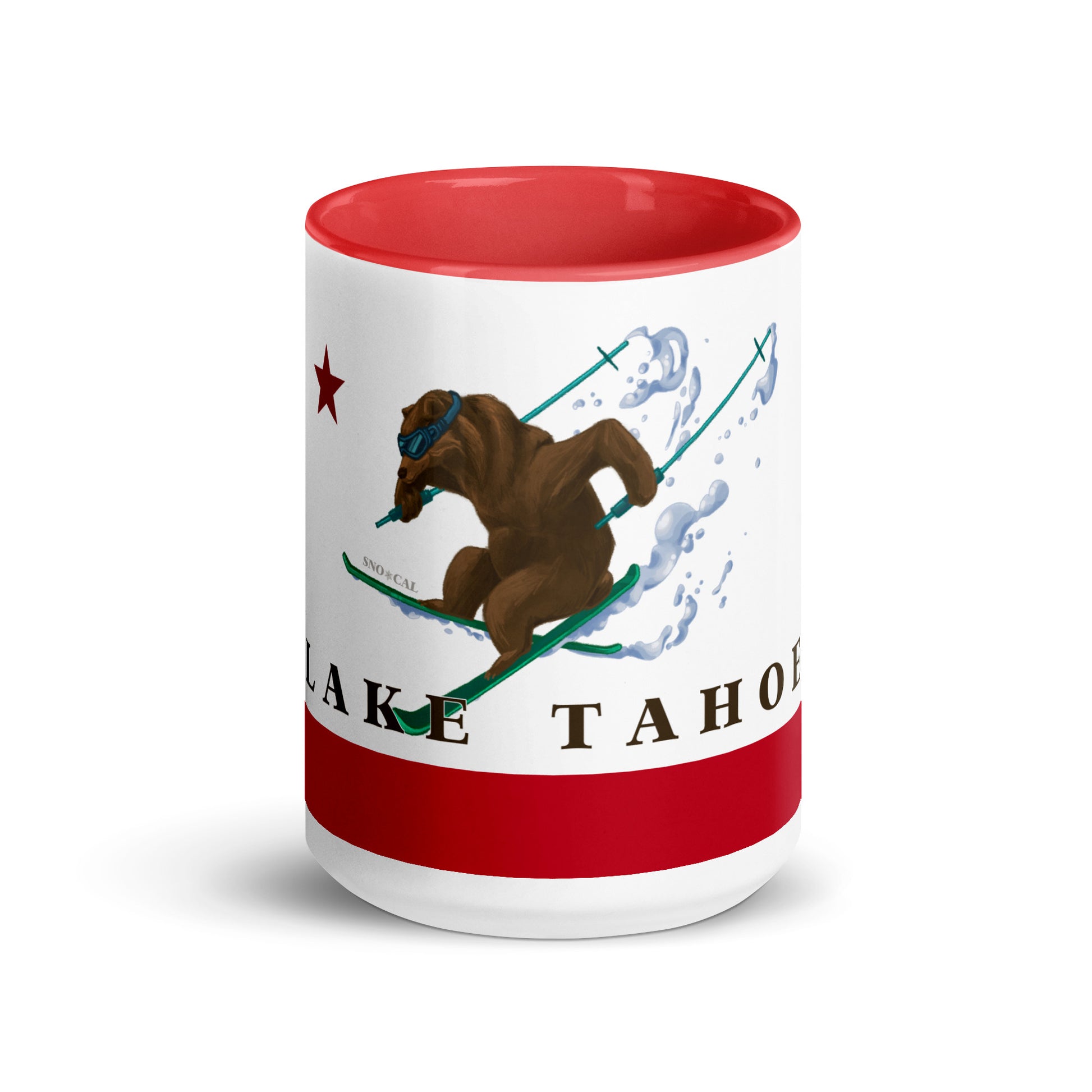 Drink your morning coffee or tea with this Lake Tahoe CA skiing grizzly mug! These ceramic mugs not only have a cool CA flag design on them, but also a red rim, handle, and inside, so the mug will add some spice to your mug rack.