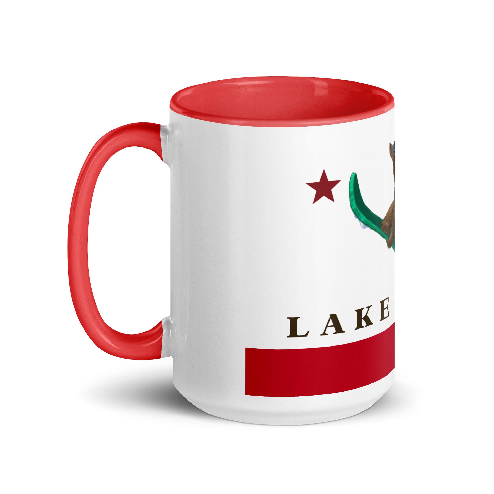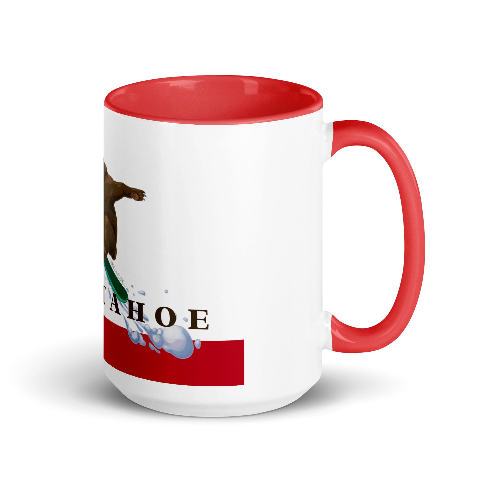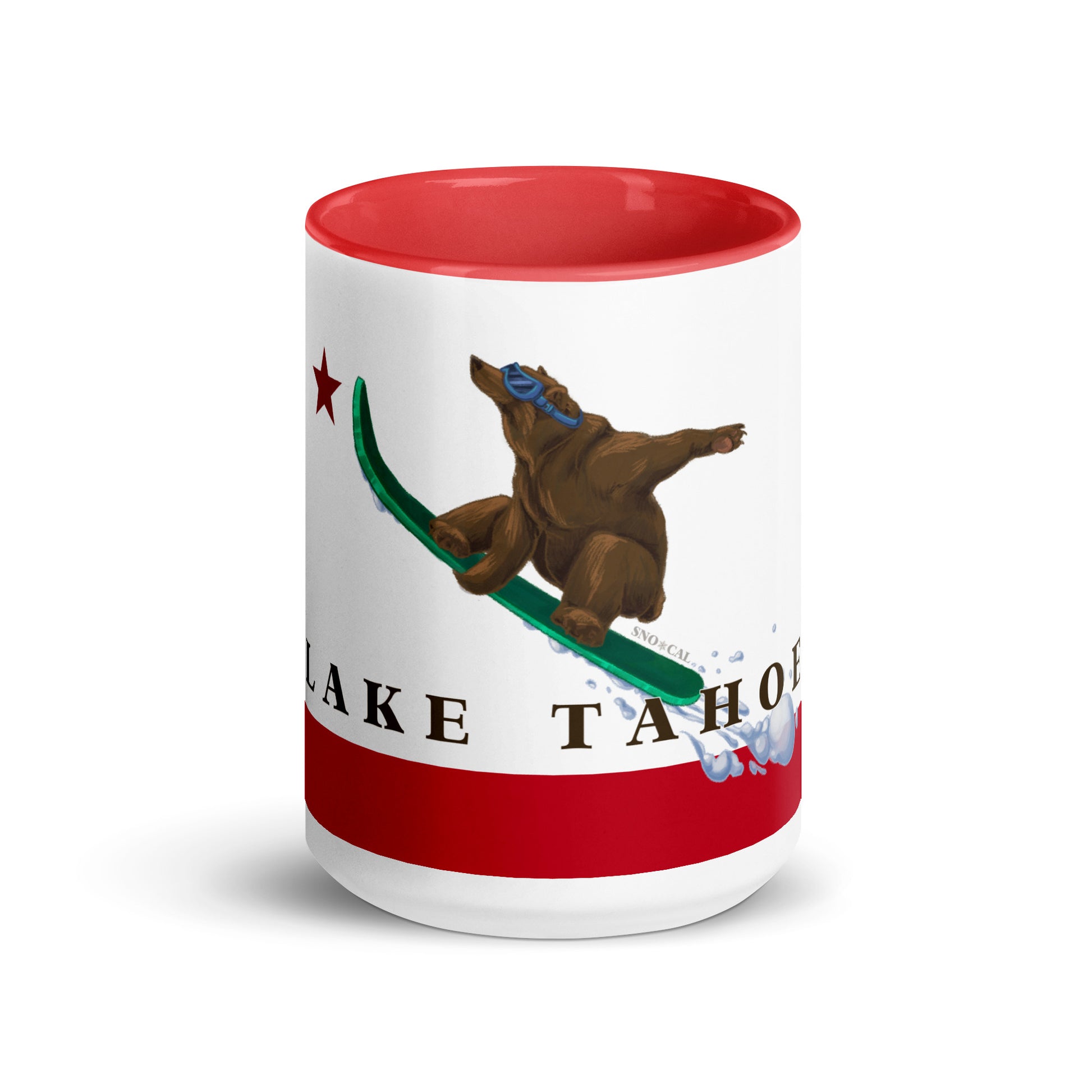 Your morning coffee or tea will taste so much better in this Lake Tahoe snowboarding grizzly mug! These ceramic mugs not only have the cool CA flag design on them, but also a red rim, handle, and inside, so the mug will surely spice up your mug rack.