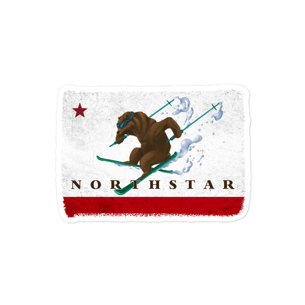 CA grizzly bear shredding on his skis on this CA flag North Star sticker.