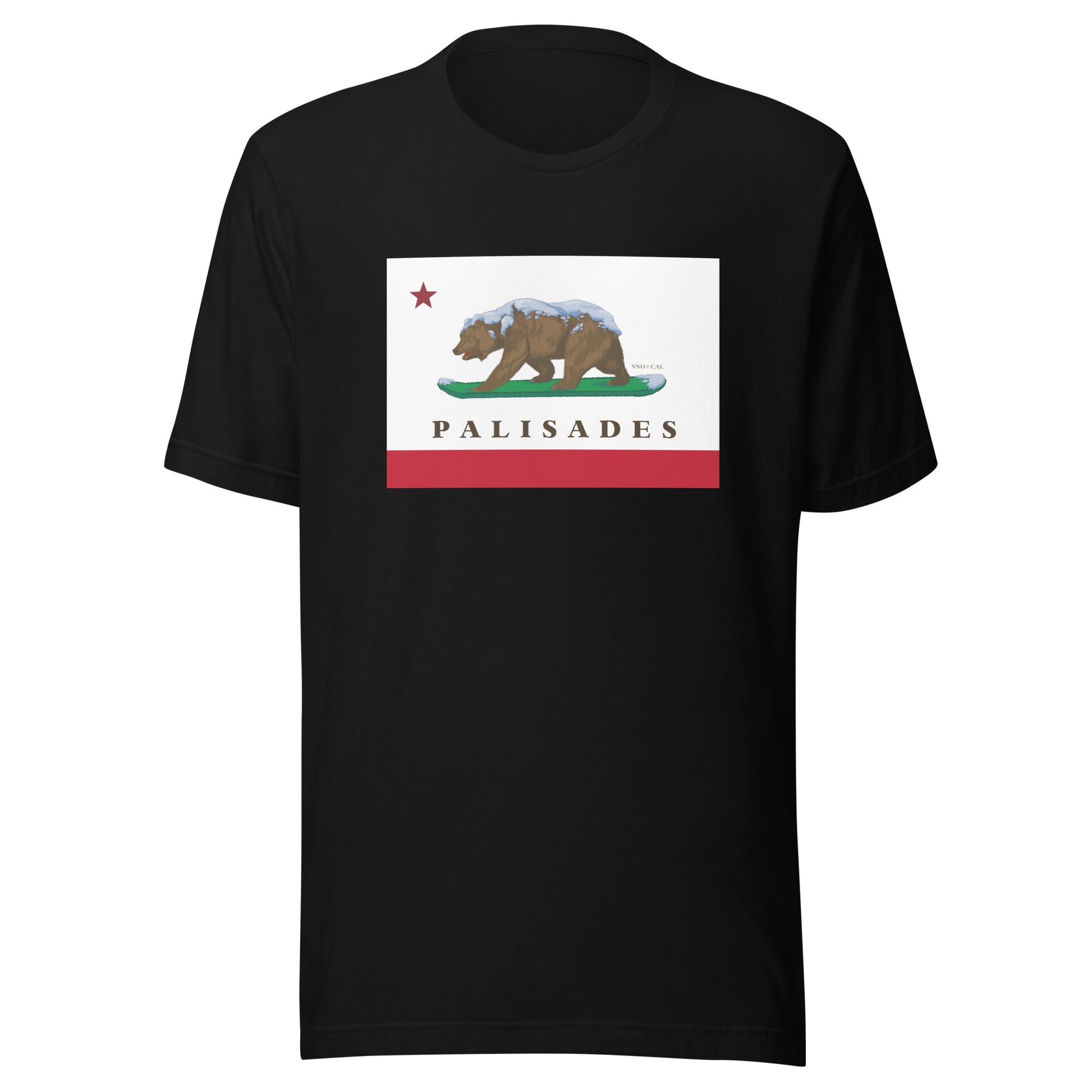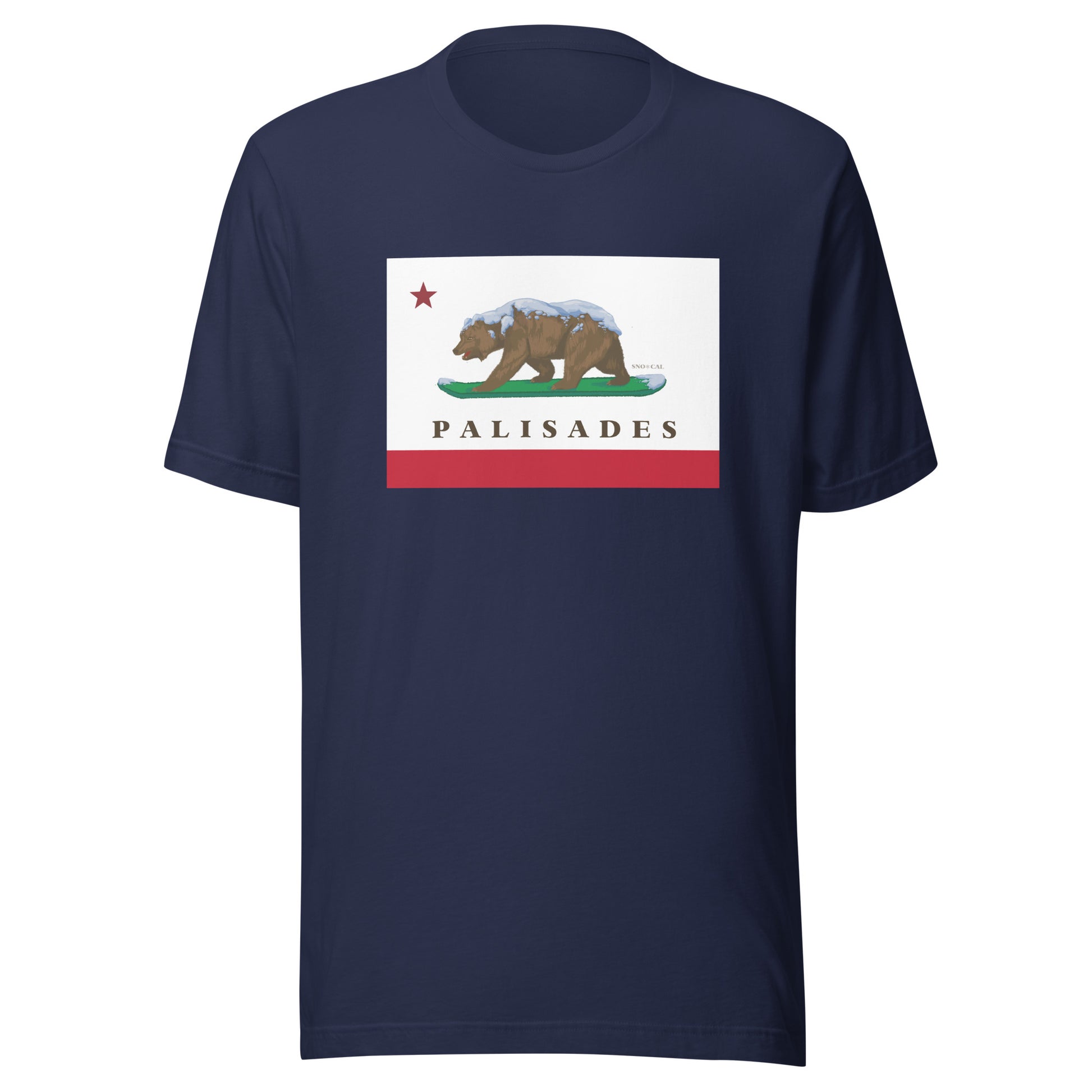 Palisades CA state flag style shirt with Goldie the Grizzly.