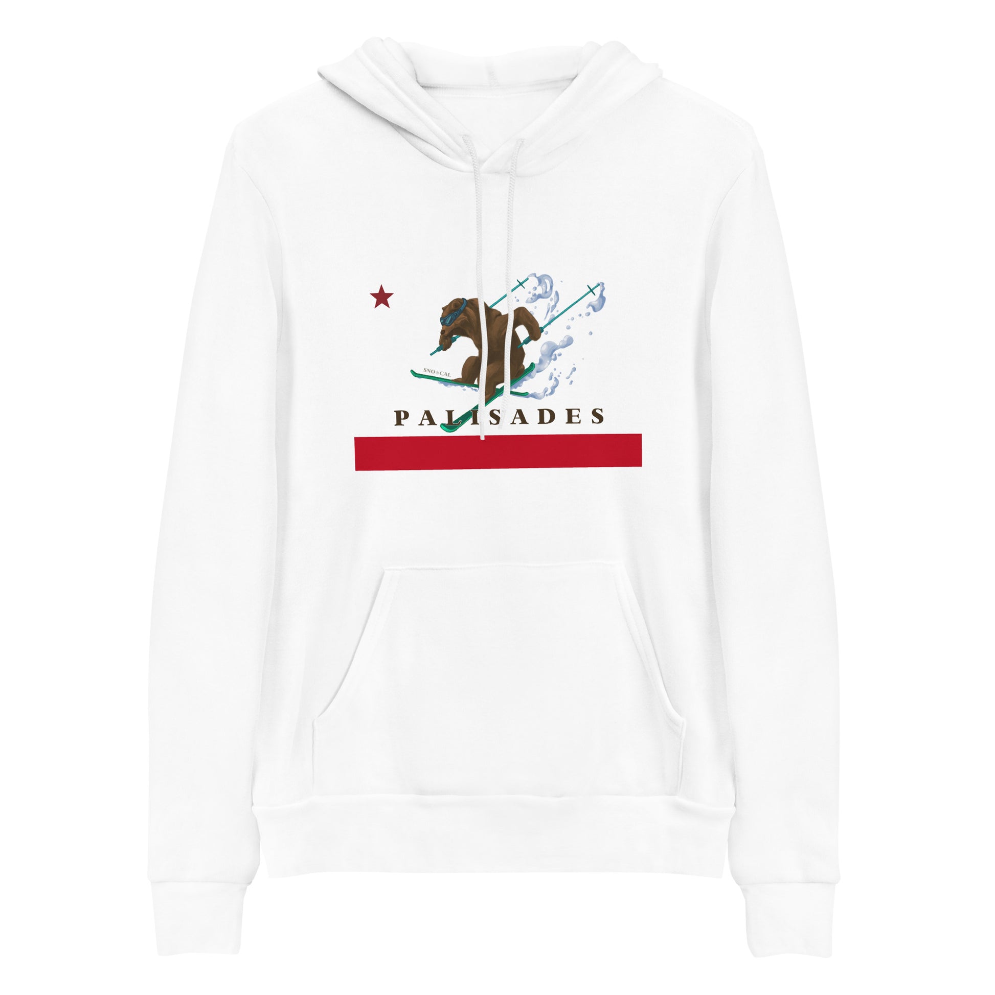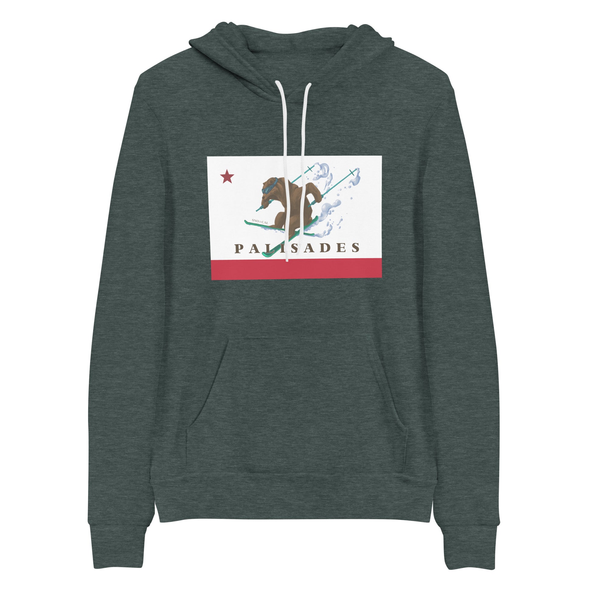Palisades CA flag style hoodie with Goldie the Grizzly skiing.