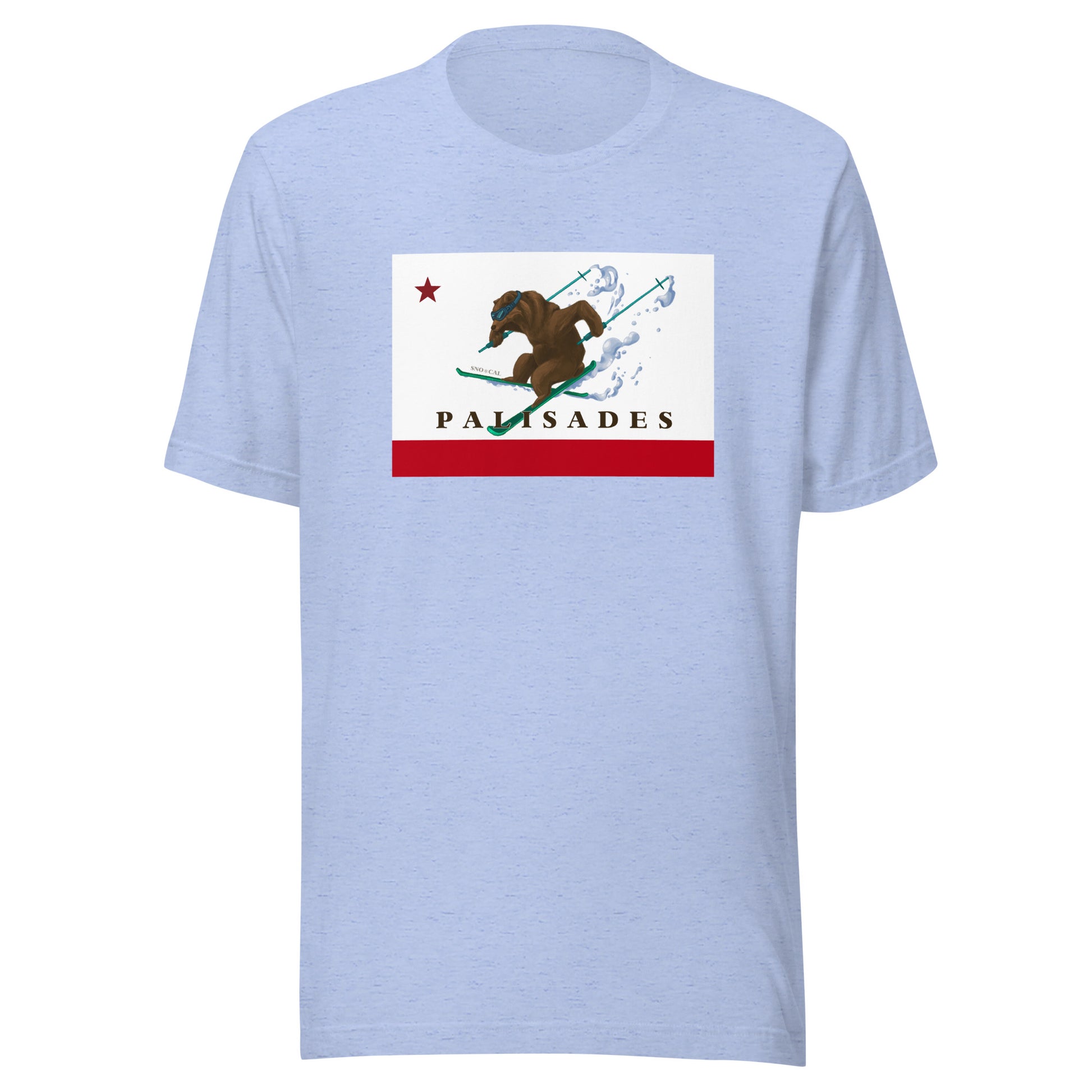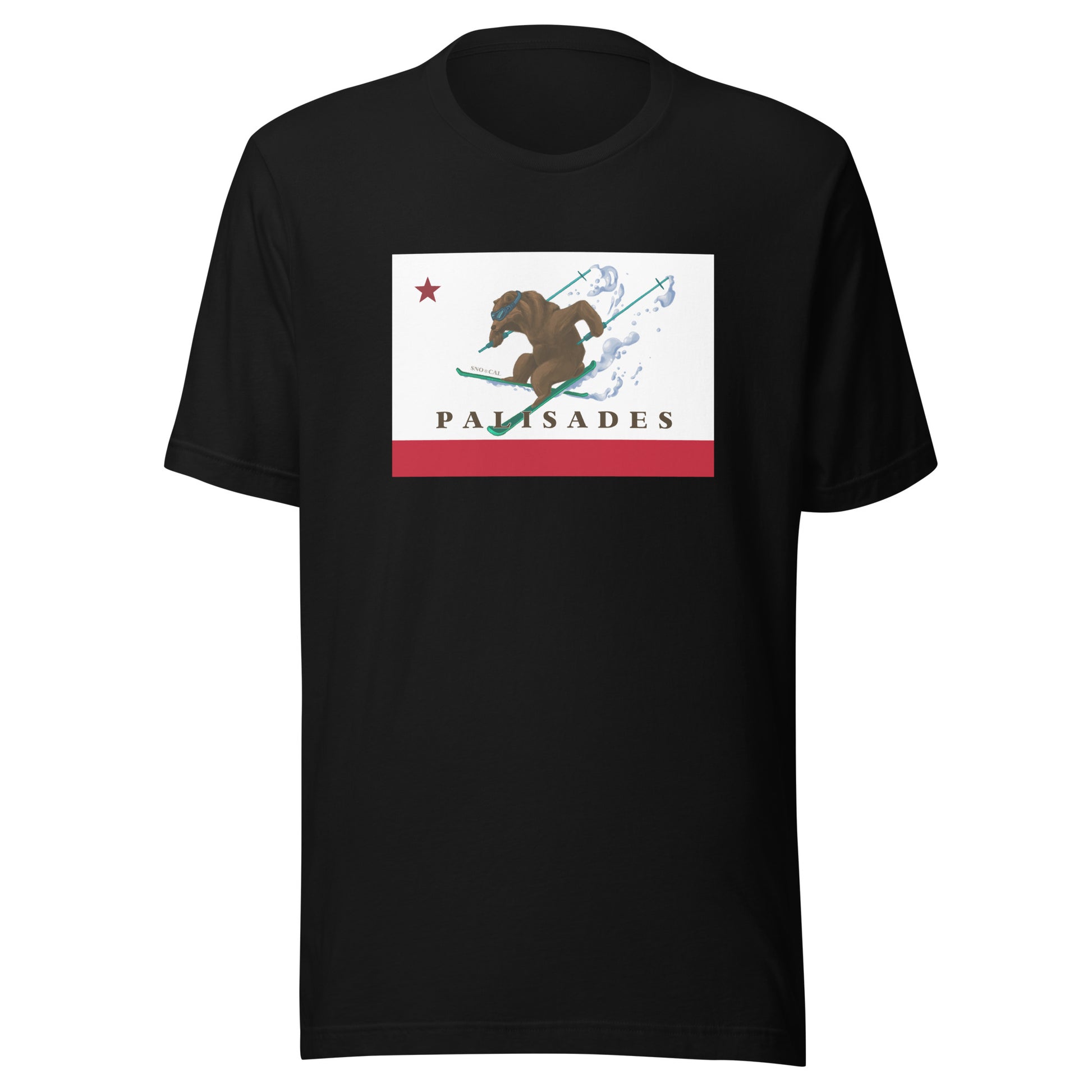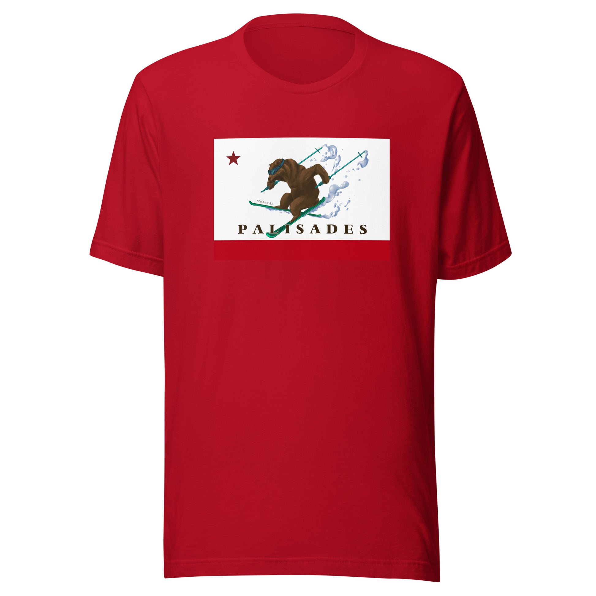 Palisades Cali state flag style shirt with Goldie the Grizzly skiing.