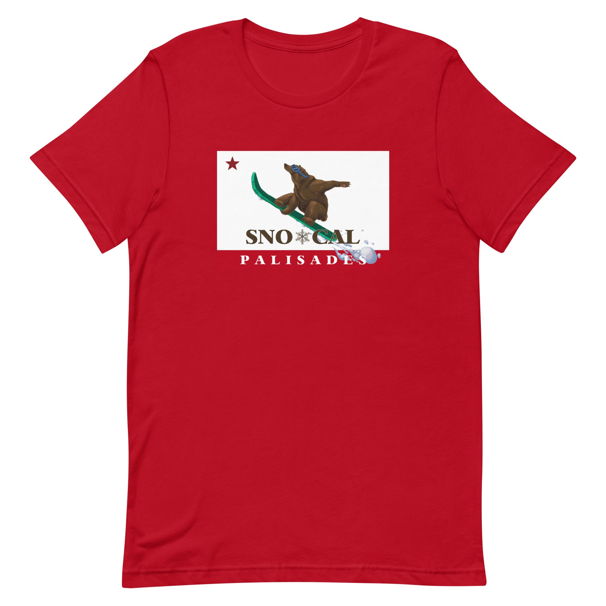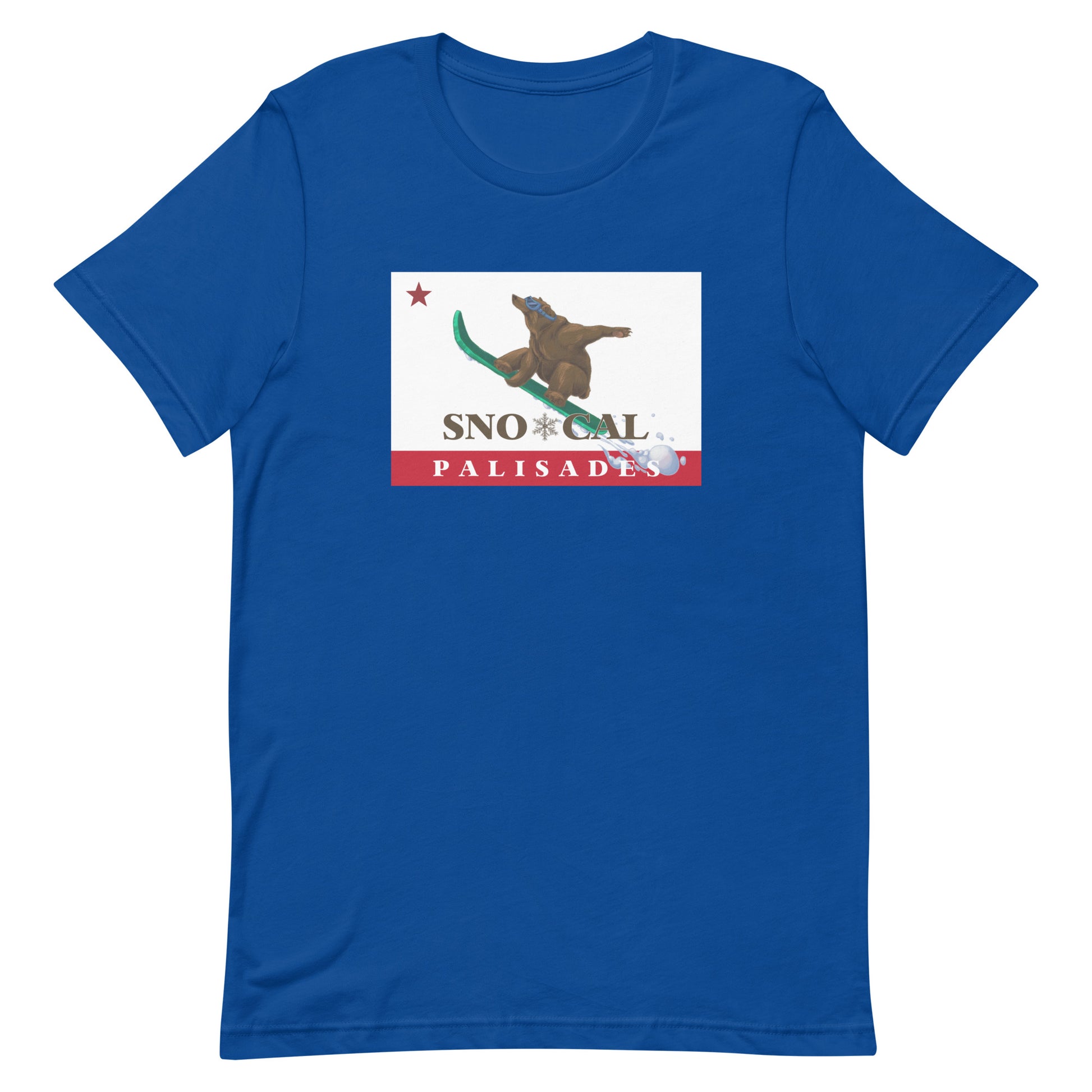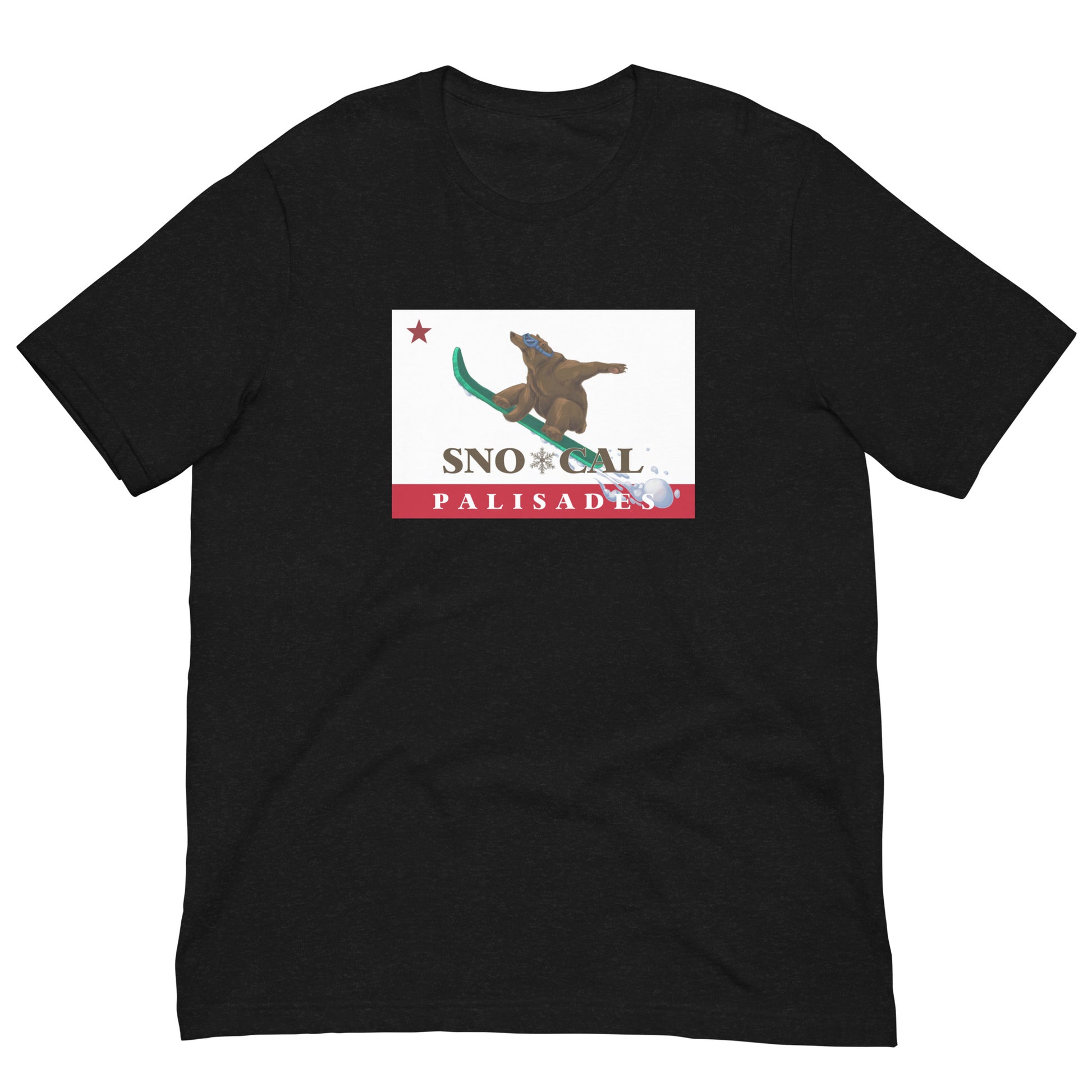 Palisades Sno*Cal CA state flag style shirt with Goldie the Grizzly boarding.