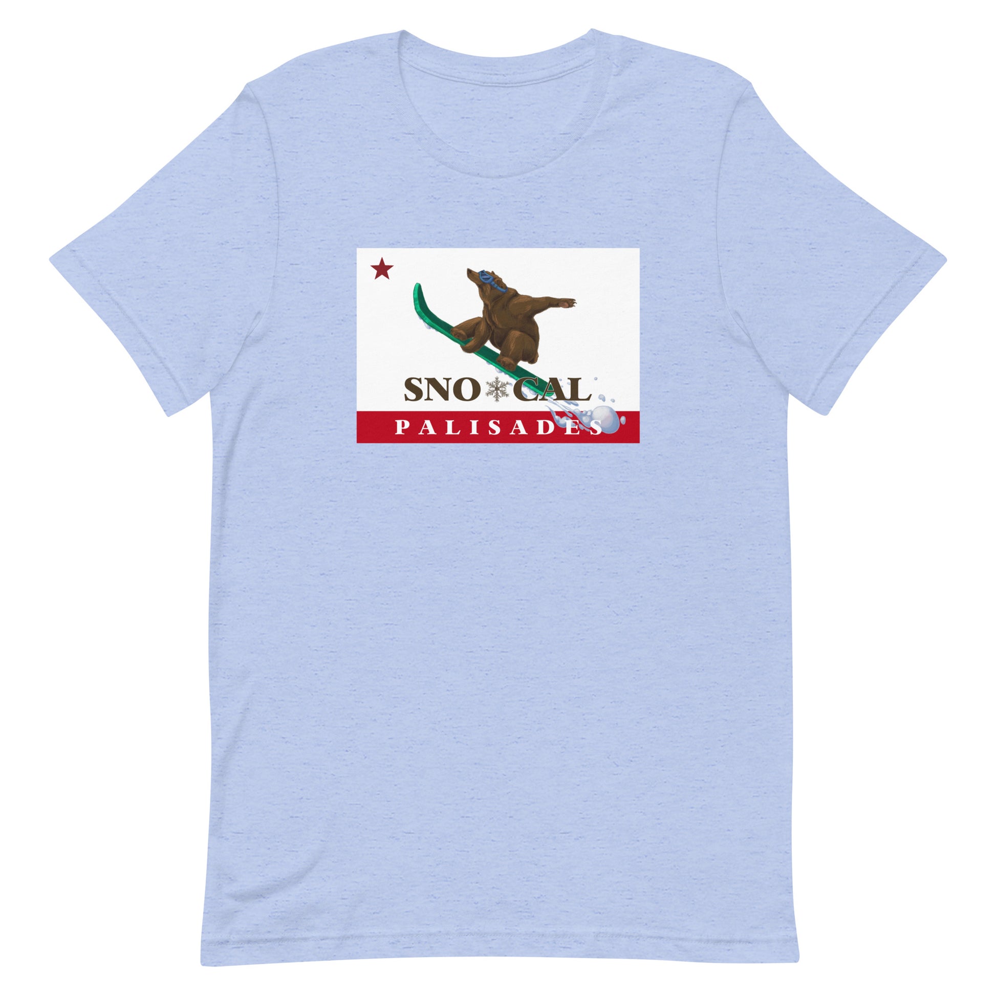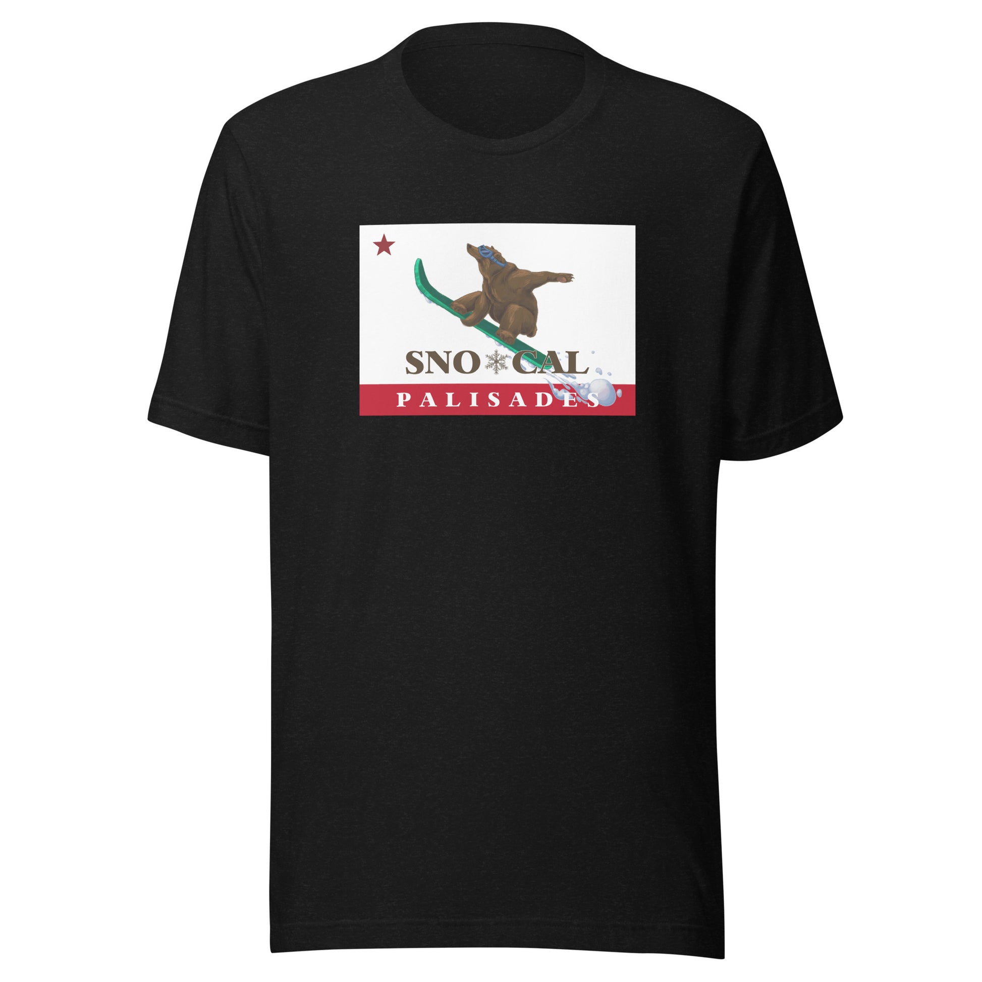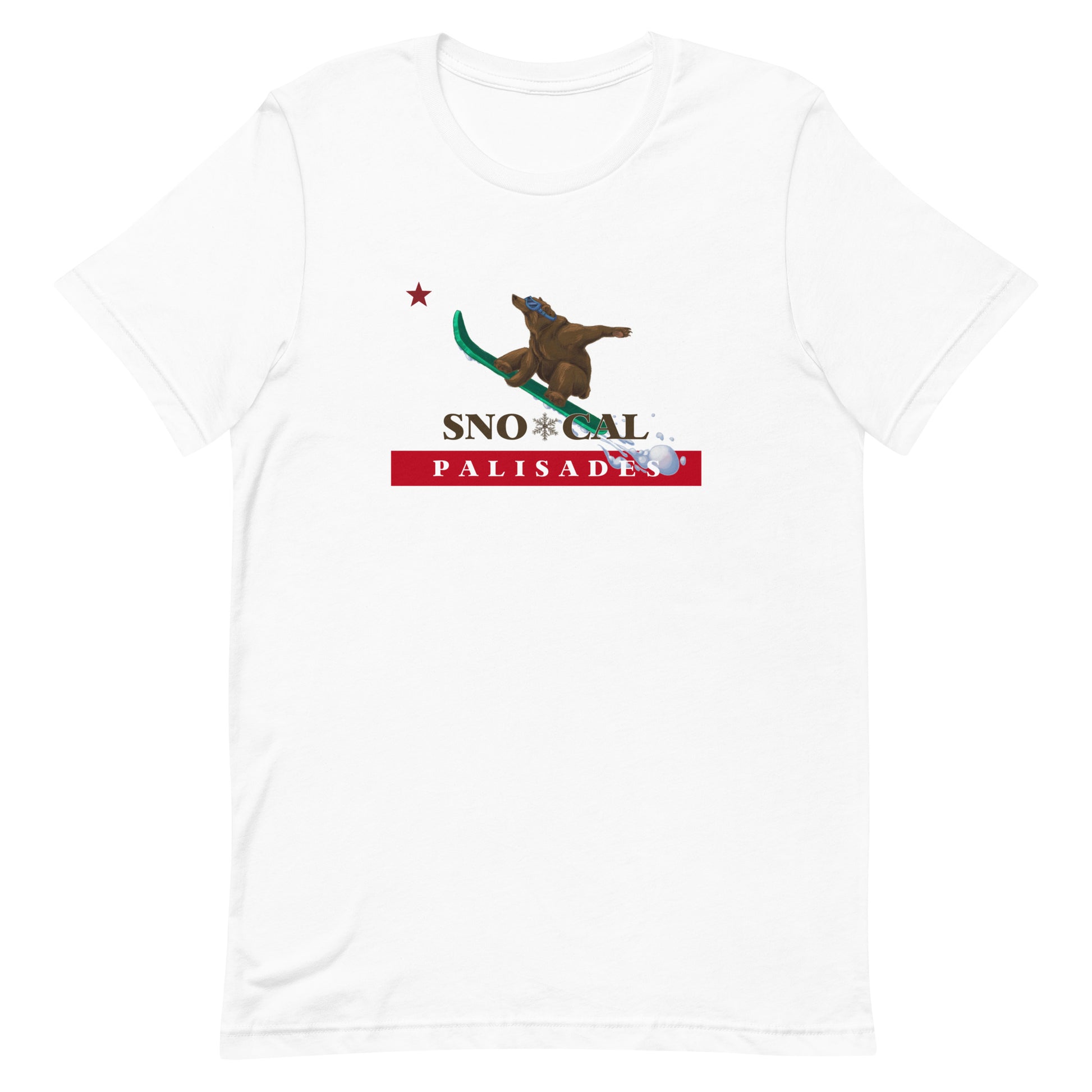 Palisades Sno*Cal CA state flag style shirt with Goldie the Grizzly boarding.
