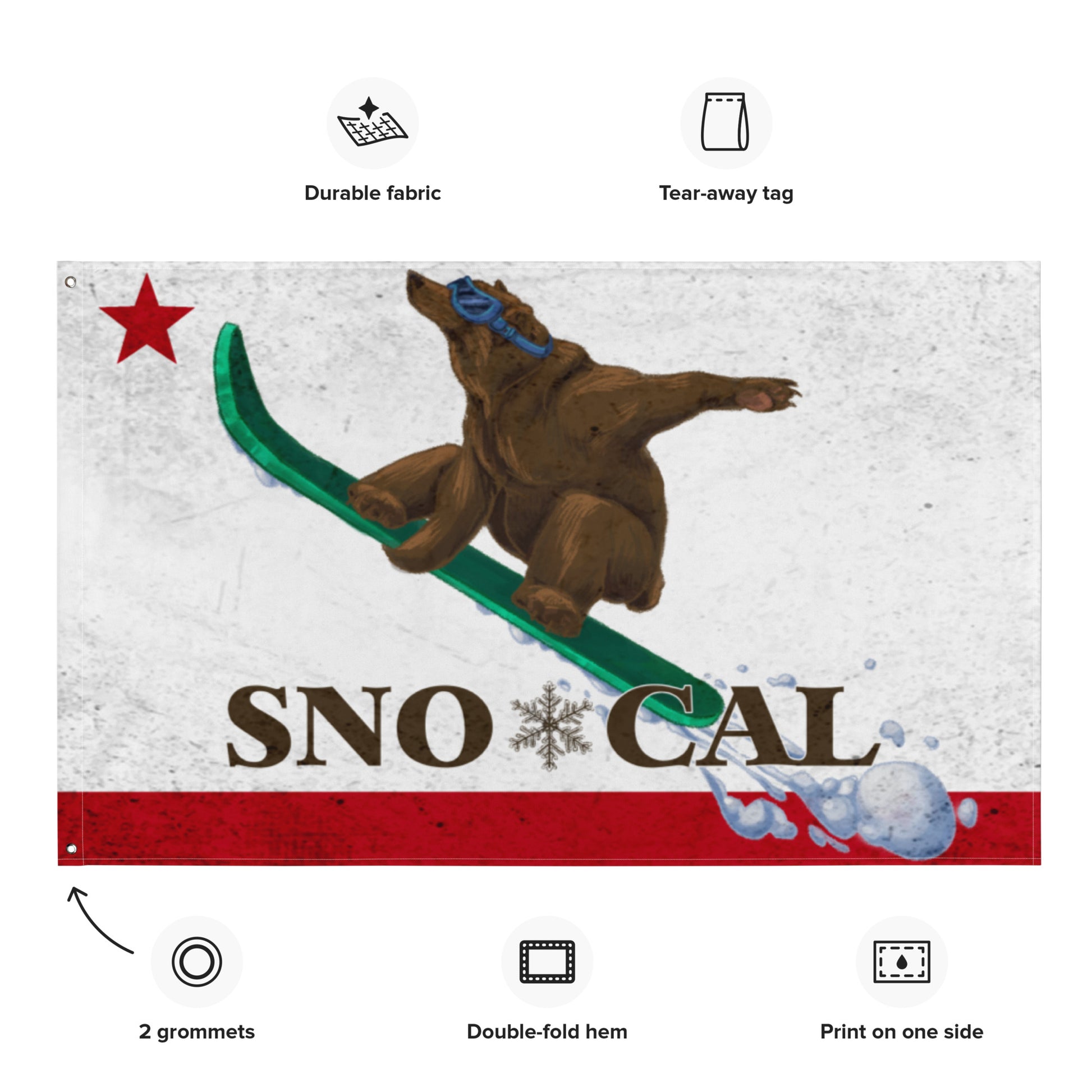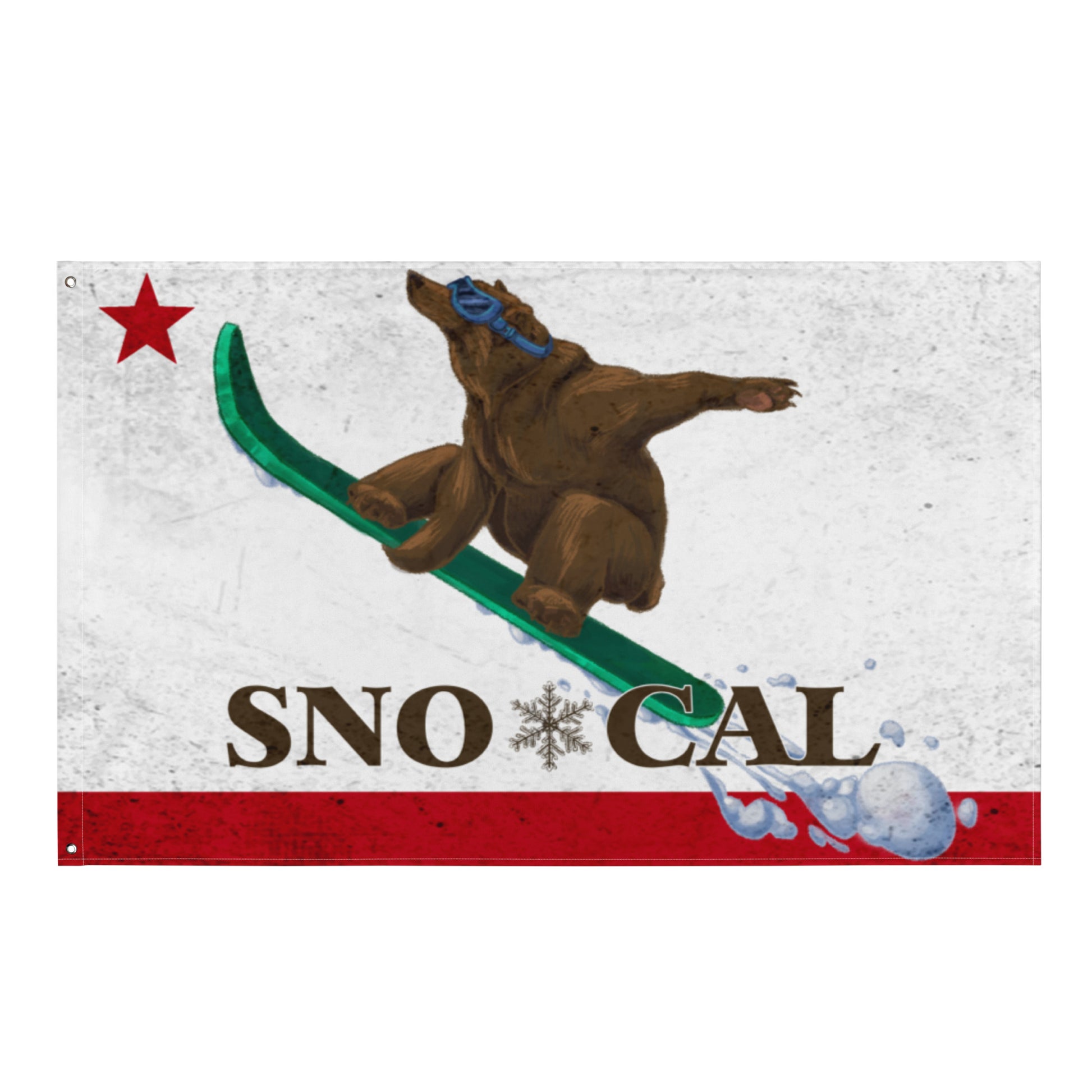 Sno*Cal flag with Goldie the Grizzly boarding. The flag won’t crease or shrink thanks to the polyester material and it will last a long time.